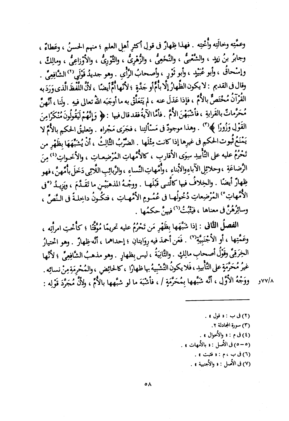 الفصلُ الثَّانى: إذا شَبَّهَها بِظَهْرِ مَن تَحْرُمُ عليه تحريمًا مُؤَقَّتًا؛ كأُخْتِ امرأَتِه، وعَمَّتِها، أو الأجْنَبِيَّةِ (٧). فَعَن أحمدَ فيه رِوَايتانِ؛ إحداهما، أنَّه ظِهارٌ. وهو اخْتيارُ الخِرَقِيِّ وقَوْلُ أصحابِ مالِكٍ، والثَّانِيَةُ، ليس بِظهارٍ. وهو مذهبُ الشَّافِعِىِّ؛ لأنَّها غيرُ مُحَرَّمَةٍ على التَّأْبيدِ، فَلا يكونُ التَّشْبِيهُ بها ظهارًا، كالحائِضِ، والمُحْرِمَةِ مِنْ نسائِه. ووَجْهُ الأوَّلِ، أنَّه شَبَّهها بِمُحَرَّمَةٍ، فأشْبَهَ ما لو شبَّهها بالأُمِّ، ولأنَّ مُجَرَّدَ قَوْلِه: