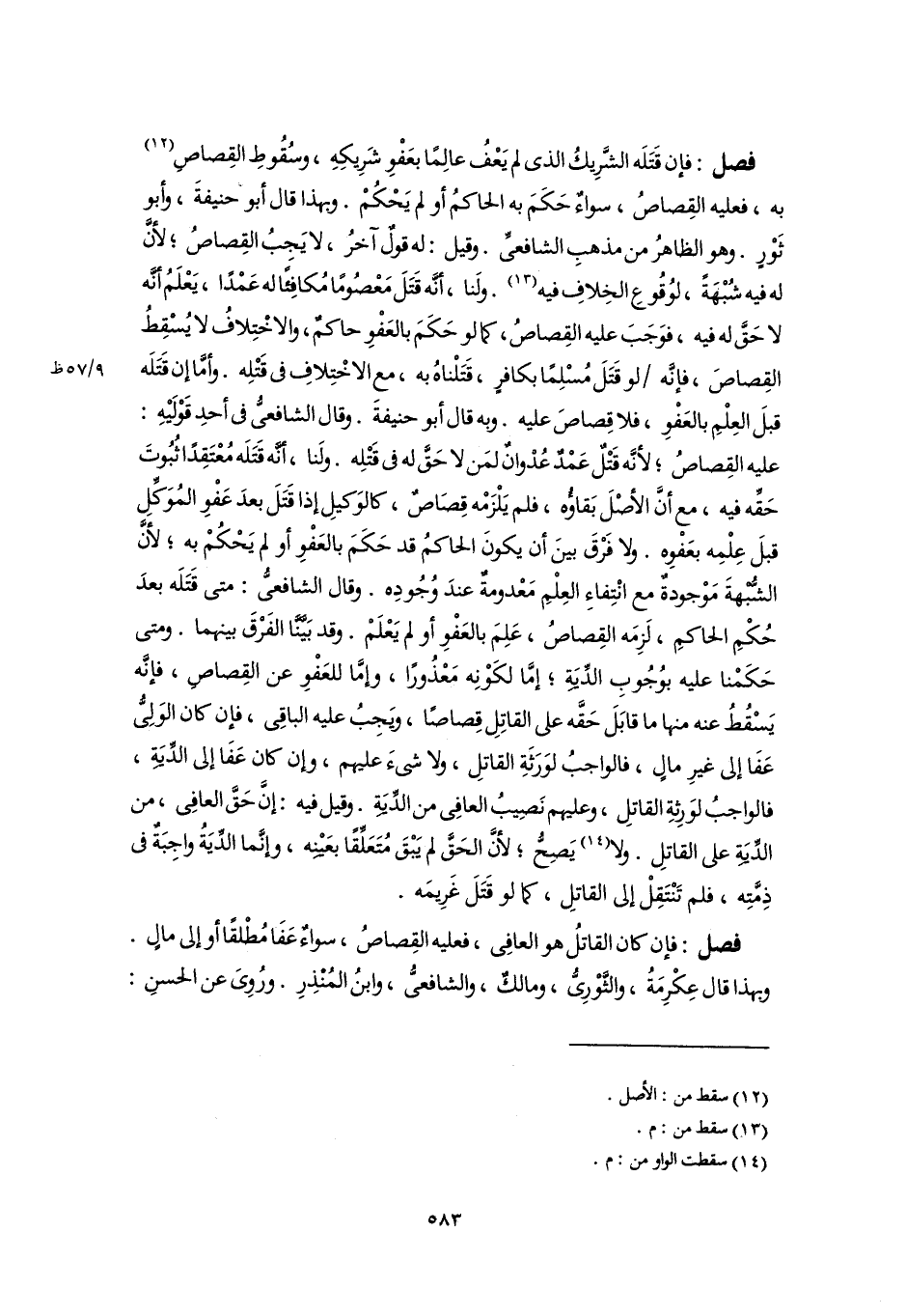 فصل: فإن قَتَلَه الشَّرِيكُ الذي لم يَعْفُ عالِمًا بعَفْوِ شَرِيكِهِ، وسُقُوطِ القِصاصِ (١٢) به، فعليه القِصاصُ، سواءٌ حَكَمَ به الحاكمُ أو لم يَحْكُمْ. وبهذا قال أبو حنيفةَ، وأبو ثَوْرٍ. وهو الظاهرُ من مذهبِ الشافعيِّ. وقيل: له قولٌ آخرُ، لا يَجِبُ القِصاصُ؛ لأنَّ له فيه شُبْهَةً، لوُقُوعِ الخِلافِ فيه (١٣). ولَنا، أنَّه قَتَلَ مَعْصُومًا مُكافِئًا له عَمْدًا، يَعْلَمُ أنَّه لا حَقَّ له فيه، فوَجَبَ عليه القِصاصُ، كما لو حَكَمَ بالعَفْوِ حاكمٌ، والاخْتِلافُ لا يُسْقِطُ القِصاصَ، فإنَّه لو قَتَلَ مُسْلِمًا بكافرٍ، قَتَلْناهُ به، مع الاخْتِلافِ في قَتْلِه. وأمَّا إن قَتَلَه قبلَ العِلْمِ بالعَفْوِ، فلا قِصاصَ عليه. وبه قال أبو حنيفةَ. وقال الشافعيُّ في أحدِ قَوْلَيْهِ: عليه القِصاصُ؛ لأنَّه قَتْلٌ عَمْدٌ عُدْوانٌ لمَن لا حَقَّ له في قَتْلِه. ولَنا، أنَّه قَتَلَه مُعْتَقِدًا ثُبُوتَ حَقِّه فيه، مع أنَّ الأصْلَ بَقاؤُه، فلم يَلْزَمْه قِصَاصٌ، كالوَكيلِ إذا قَتَلَ بعدَ عَفْوِ المُوَكِّلِ قبلَ عِلْمِه بعَفْوِه. ولا فَرْقَ بينَ أن يكونَ الحاكمُ قد حَكَمَ بالعَفْوِ أو لم يَحْكُمْ به؛ لأنَّ الشُّبْهةَ مَوْجودةٌ مع انْتِفاءِ العِلْمِ مَعْدومةٌ عندَ وُجُودِه. وقال الشافعيُّ: متى قَتَلَه بعدَ حُكْمِ الحاكمِ، لَزِمَه القِصاصُ، عَلِمَ بالعَفْوِ أو لم يَعْلَمْ. وقد بَيَّنَّا الفَرْقَ بينهما. ومتى حَكَمْنا عليه بوُجُوبِ الدِّيَةِ؛ إمَّا لكَوْنِه مَعْذُورًا، وإمَّا للعَفْوِ عن القِصاصِ، فإنَّه يَسْقُطُ عنه منها ما قابَلَ حَقَّه على القاتِلِ قِصاصًا، ويَجِبُ عليه الباقِي، فإن كان الوَلِيُّ عَفَا إلى غيرِ مالٍ، فالواجبُ لوَرَثَةِ القاتلِ، ولا شىءَ عليهم، وإن كان عَفَا إلى الدِّيَةِ، فالواجبُ لوَرَثةِ القاتلِ، وعليهم نَصِيبُ العافِي من الدِّيَةِ. وقيل فيه: إنَّ حَقَّ العافِي، من الدِّيَةِ على القاتلِ. ولا (١٤) يَصِحُّ؛ لأنَّ الحَقَّ لم يَبْقَ مُتَعَلِّقًا بعَيْنِه، وإنَّما الدِّيَةُ واجِبَةٌ في ذِمَّتِه، فلم تَنْتَقِلْ إلى القاتلِ، كما لو قَتَلَ غَرِيمَه.