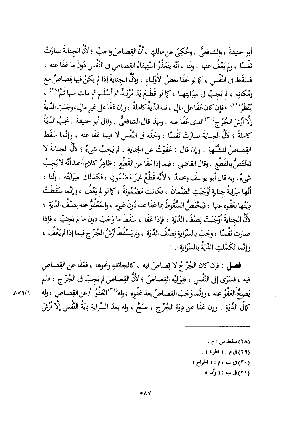 أبو حنيفةَ، والشافعيُّ. وحُكِىَ عن مالكٍ، أنَّ القِصاصَ واجبٌ؛ لأنَّ الجِنايةَ صارَتْ نَفْسًا، ولم يَعْفُ عنها. ولَنا، أنَّه يتَعَذَّرُ اسْتِيفاءُ القِصاصِ في النَّفْسِ دُونَ ما عَفَا عنه، فسَقَطَ في النَّفْسِ، كما لو عَفَا بعضُ الأوْلياءِ، ولأنَّ الجِنايةَ إذا لم يكنْ فيها قِصاصٌ مع إمْكانِه، لم يَجِبْ في سِرَايتِها، كما لو قَطَعَ يَدَ مُرْتَدٍّ ثم أسْلَم ثم مات منها ثَمَّ (٢٨)، يُنْظَرُ (٢٩)؛ فإن كان عَفَا على مالٍ، فله الدِّيةُ كاملةً، وإن عَفَا على غيرِ مالٍ، وجَبَتِ الدِّيَةُ إلَّا أرْشَ الجُرْحِ (٣٠) الذي عَفَا عنه. وبهذا قال الشافعيُّ. وقال أبو حنيفةَ: تجبُ الدِّيَةُ كاملةً؛ لأنَّ الجِنايةَ صارَتْ نَفْسًا، وحَقُّه في النَّفْسِ لا فيما عَفَا عنه، وإنَّما سَقَطَ القِصاصُ للشُّبْهةِ. وإن قال: عَفَوْتُ عن الجنايةِ. لم يَجِبْ شيءٌ؛ لأنَّ الجِنايةَ لا تَخْتَصُّ بالقَطْعِ. وقال القاضي، فيما إذا عَفَا عن القَطْعِ: ظاهِرُ كلامِ أحمدَ أنَّه لا يَجِبُ شيءٌ. وبه قال أبو يوسفَ ومحمدٌ؛ لأنَّه قَطْعٌ غيرُ مَضْمُونٍ، فكذلك سِرَايَتُه. ولَنا، أنَّها سِرَايةُ جِنايةٍ أوْجَبَتِ الضَّمانَ، فكانت مَضْمُونةً، كما لو لم يَعْفُ، وإنَّما سَقَطَتْ دِيَتُها بعَفْوِه عنها، فيَخْتَصُّ السُّقُوطُ بما عَفَا عنه دُونَ غيرِه، والمَعْفُوُّ عنه نِصْفُ الدِّيَةِ؛ لأنَّ الجِنايةَ أوْجَبَتْ نِصْفَ الدِّيَةِ، فإذا عَفَا، سَقَطَ ما وَجَبَ دون ما لم يَجِبْ، فإذا صارت نَفْسًا، وجَبَ بالسِّرَايةِ نِصْفُ الدِّيَةِ، ولم يَسْقُطْ أرْشُ الجُرْحِ فيما إذا لم يَعْفُ، وإنَّما تَكَمَّلتِ الدِّيَةُ بالسِّرَايةِ.