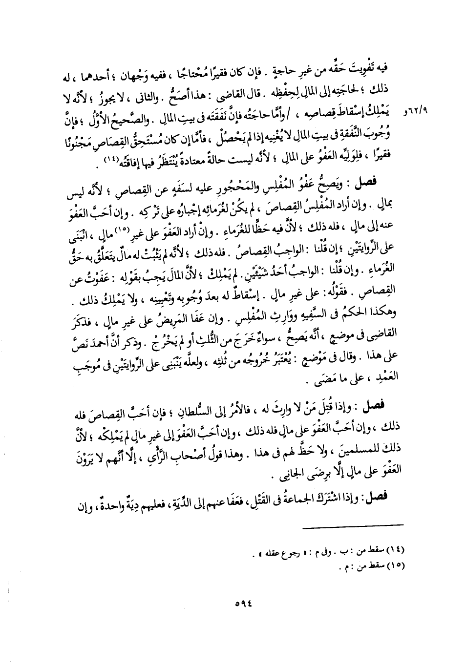 فيه تَفْوِيتَ حَقِّه من غيرِ حاجةٍ. فإن كان فقيرًا مُحْتاجًا، ففيه وَجْهان؛ أحدهما، له ذلك؛ لحاجَتِه إلى المالِ لِحِفْظِه. قال القاضي: هذا أصَحُّ. والثاني، لا يجوزُ؛ لأنَّه لا يَمْلِكُ إسْقاطَ قِصاصِه، وأمَّا حاجَتُه فإنَّ نَفقَتَه في بيتِ المالِ. والصَّحيحُ الأوَّلُ؛ فإنَّ وُجُوبَ النَّفَقةِ في بيتِ المالِ لا يُغْنِيه إذا لم يَحْصُلْ، فأمَّا إن كان مُسْتَحِقُّ القِصَاصِ مَجْنُونًا فقيرًا، فلِوَلِيِّه العَفْوُ على المالِ؛ لأنَّه ليست حالةً معتادةً يُنْتَظَرُ فيها إفاقَتُه (١٤).