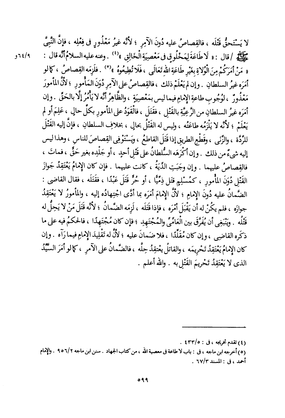 لا يَسْتَحقُّ قَتْلَه، فالقِصاصُ عليه دُونَ الآمِرِ؛ لأنَّه غيرُ مَعْذُورٍ في فِعْلِه، فإنَّ النَّبِىَّ -صلى اللَّه عليه وسلم- قال: "لَا طَاعَةَ لِمَخْلُوقٍ في مَعْصِيَةِ الْخَالِقِ" (٤). وعنه عليه السلامُ أنَّه قال: "مَنْ أمَرَكُمْ مِنَ الْوُلاةِ بِغَيْرِ طَاعَةِ اللهِ تَعَالَى، فَلَا تُطِيعُوهُ" (٥). فلَزِمَه القِصاصُ، كما لو أمَرَه غيرُ السلطانِ. وإن لم يَعْلَمْ ذلك، فالقِصاصُ على الآمِرِ دُونَ المَأْمورِ؛ لأنَّ المأمورَ مَعْذُورٌ، لوُجُوبِ طاعةِ الإِمامِ فيما ليس بمَعْصِيَةٍ، والظَّاهِرُ أنَّه لا يَأْمُرُ إلَّا بالحَقِّ. وإن أمَرَه غيرُ السلطانِ من الرَّعِيَّةِ بالقَتْلِ، فقَتَلَ، فالْقَوَدُ على المأمورِ بكلِّ حالٍ، عَلِمَ أو لم يَعْلَمْ؛ لأنَّه لا يَلْزَمُه طاعَتُه، وليس له القَتْلُ بحالٍ، بخلافِ السلطانِ، فإنَّ إليه القَتْلَ للرِّدَّة، والزِّنَى، وقَطْعِ الطريقِ إذا قَتَلَ القاطعُ، ويَسْتَوْفِى القِصاصَ للناسِ، وهذا ليس إليه شيءٌ من ذلك. وإن أكْرَهَه السُّلطانُ على قَتْلِ أحدٍ، أو جَلْدِه بغير حَقٍّ، فماتَ، فالقِصاصُ عليهما. وإن وجَبَتِ الدِّيَةُ، كانت عليهما. فإن كان الإِمامُ يَعْتَقِدُ جَوازَ القَتْلِ دُونَ المأْمورِ، كمُسْلِمٍ قتَل ذِمِّيًّا، أو حُرٍّ قَتَلَ عَبْدًا، فقَتَلَه، فقال القاضي: الضَّمانُ عليه دُونَ الإِمامِ؛ لأنَّ الإِمامَ أمَرَه بما أدَّى اجْتِهادُه إليه، والمأمورُ لا يَعْتَقِدُ جوازَه، فلم يكُنْ له أن يَقْبَلَ أمْرَه، فإذا قَتَلَه، لَزِمَه الضَّمانُ؛ لأنَّه قَتَلَ مَنْ لا يَحِلُّ له قَتْلُه. ويَنْبَغِى أن يُفَرَّقَ بين الْعَامِّىِّ والمُجْتَهِدِ؛ فإن كان مُجْتَهِدًا، فالحكمُ فيه على ما ذكَره القاضِى، وإن كان مُقَلِّدًا، فلا ضَمانَ عليه؛ لأنَّ له تَقْلِيدَ الإِمامِ فيما رَآه. وإن كان الإِمامُ يَعْتَقِدُ تَحْرِيمَه، والقاتلُ يعْتقِدُ حِلَّه، فالضَّمانُ على الآمرِ، كما لو أمَرَ السَّيِّدُ الذي لا يَعْتَقِدُ تَحْريمَ القَتْلِ به. واللَّه أعلم.