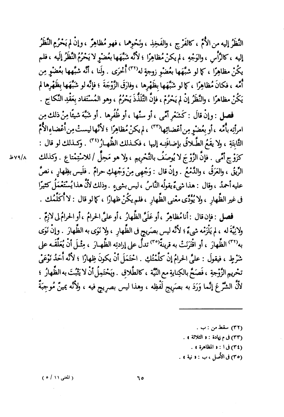 فصل: وإِنْ قالَ: كَشَعْرِ أمِّى، أو سنِّها، أو ظُفُرِها. أو شَبَّهَ شيئًا مِنْ ذلك مِن امرأتِه بأُمِّه، أو بِعُضْوٍ مِن أعْضائِها (٣٣)، لم يكنْ مُظاهِرًا؛ لأنَّها ليستْ مِن أَعْضاءِ الأُمِّ الثَّابِتَةِ، ولا يقَعُ الطَّلاقُ بإضافَتِه إليها، فكذلك الظِّهارُ (٣٤). وكذلك لو قال: كزَوْجِ أمِّى. فإنَّ الزَّوْجَ لا يُوصَفُ بالتَّحْرِيمِ، ولا هو مَحِلٌّ للاسْتِمْتاعِ. وكذلك الرِّيقُ، والعَرَقُ، والدَّمْعُ. وإِنْ قال: وَجْهِى مِنْ وَجْهِكِ حرامٌ. فلَيس بظِهارٍ، نصَّ عليه أحمدُ، وقال: هذا شىءٌ يقولُه النَّاسُ، ليس بشيءٍ. وذلك لأنَّ هذا يُسْتَعْمَلُ كثيرًا فى غير الظِّهارِ، ولا يُؤَدِّى معْنى الظِّهارِ، فلم يكُنْ ظهارًا، كما لو قال: لا أُكَلِّمُك.