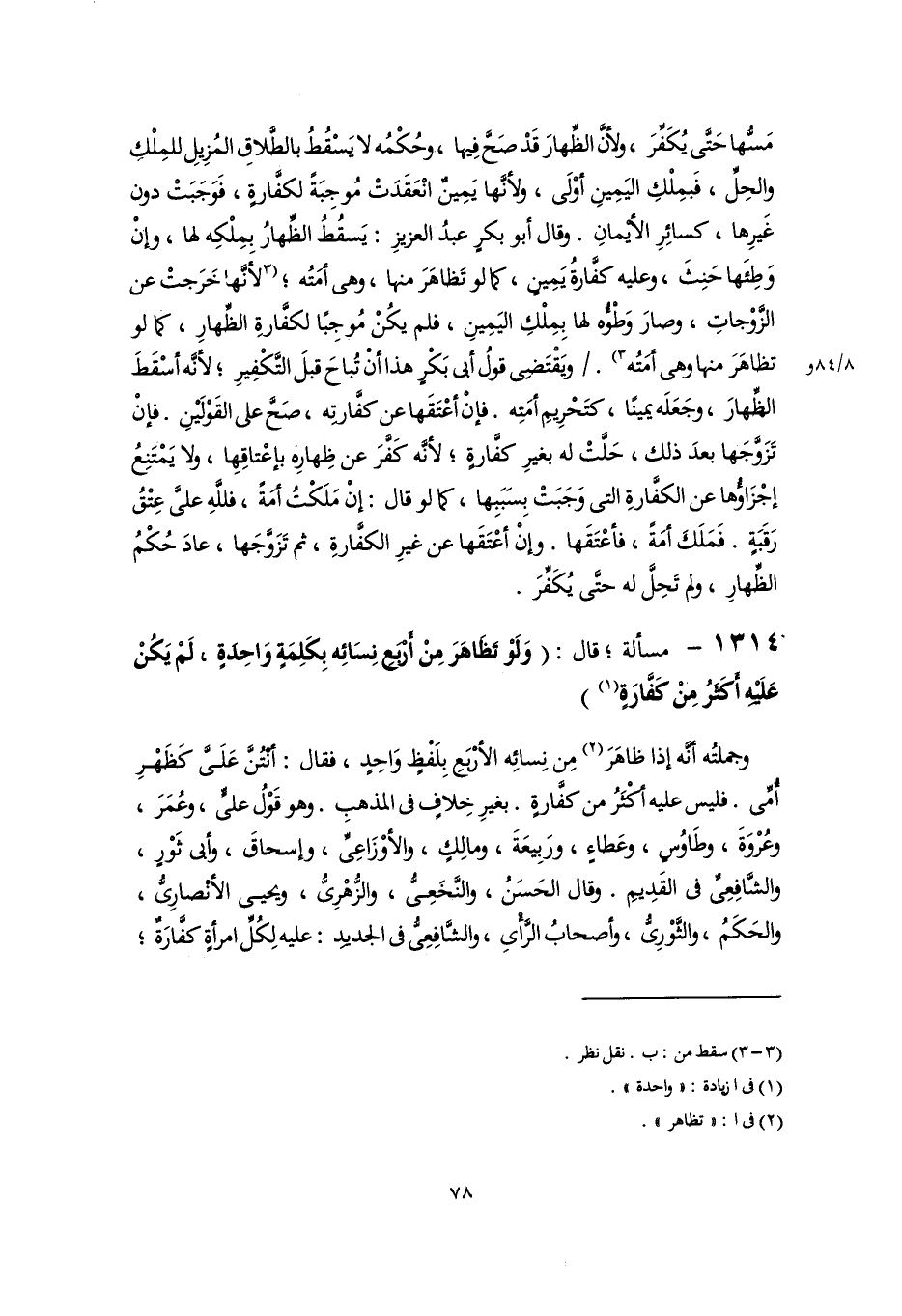 مَسُّها حَتَّى يُكَفِّرَ، ولأنَّ الظِّهارَ قَدْ صَحَّ فِيها، وحُكْمُه لا يَسْقُطُ بالطَّلاقِ المُزِيلِ للمِلْكِ والحِلِّ، فَبمِلْكِ اليَمِينِ أوْلَى، ولأنَّها يَمِينٌ انْعَقَدَتْ مُوجِبَةً لكفَّارةٍ، فَوَجَبَتْ دون غَيرِها، كسائِرِ الأيْمانِ. وقال أبو بكرٍ عبدُ العزيزِ: يَسقُطُ الظِّهارُ بمِلْكِه لها، وإِنْ وَطِئَها حَنِثَ، وعليه كفَّارةُ يَمِينٍ، كما لو تَظاهَرَ منها، وهى أمَتُه؛ [لأنَّها خَرَجتْ عن الزَّوْجاتِ، وصارَ وَطْؤُة لها بِمِلْكِ اليَمِينِ، فلم يكُنْ مُوجِبًا لكفَّارةِ الظِّهارِ، كما لو تظاهَرَ منها وهى أمَتُه] (٣). ويَقْتَضِى قولُ أبى بَكْرٍ هذا أَنْ تُباحَ قبلَ التَّكْفِيرِ؛ لأنَّه أسْقَطَ الظِّهارَ، وجَعَلَه يمينًا، كتَحْرِيمِ أمَتِه. فإنْ أعْتَقَها عن كفَّارتِه، صَحَّ على القَوْلَيْنِ. فإنْ تَزَوَّجَها بعدَ ذلك، حَلَّتْ له بغيرِ كفَّارةٍ؛ لأنَّه كَفَّرَ عن ظِهارِة بإعْتاقِهِا، ولا يَمْتَنِعُ إجْزَاؤُها عن الكفَّارةِ التى وَجَبَتْ بِسَبَبِها، كما لو قال: إنْ مَلَكْتُ أمَةً، فللَّهِ علىَّ عِتْقُ رَقَبَةٍ. فَمَلَكَ أمَةً، فأعْتَقَها. وإِنْ أعْتَقَها عن غيرِ الكفَّارةِ، ثم تَزَوَّجَها، عادَ حُكْمُ الظِّهارِ، ولم تَحِلَّ له حتَّى يُكَفِّرَ.