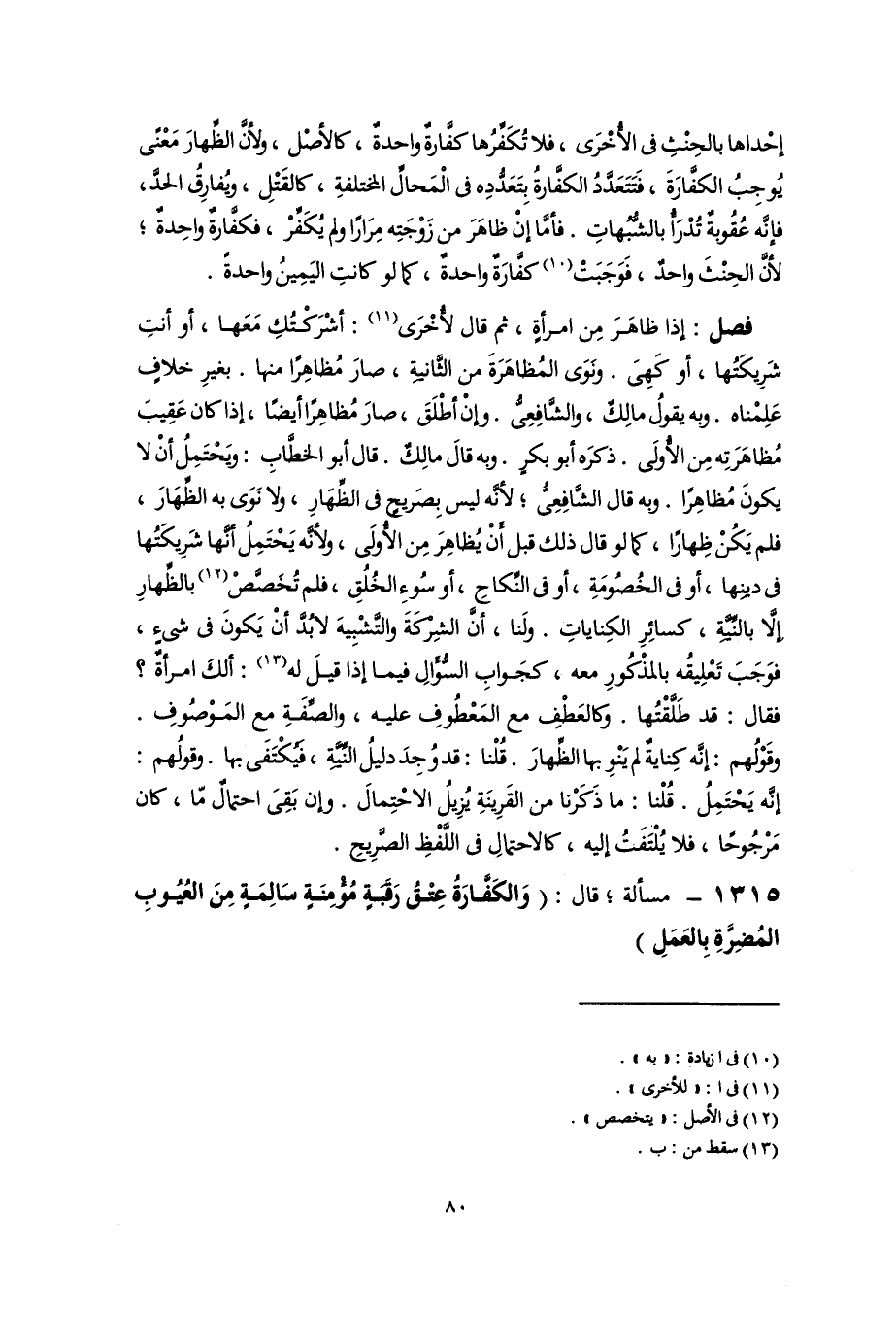 فصل: إذا ظاهَرَ مِن امرأةٍ، ثم قال لأُخْرَى (١١): أشْرَكْتُكِ مَعَها، أو أنتِ شَرِيكَتُها، أو كَهِىَ. ونَوَى المُظاهَرَةَ من الثَّانيةِ، صارَ مُظاهِرًا منها. بغيرِ خلافٍ عَلِمْناه. وبه يقولُ مالِكٌ، والشَّافِعِىُّ. وإِنْ أطْلَقَ، صارَ مُظاهِرًا أيضًا، إذا كان عَقِيبَ مُظاهَرَتِه مِن الأولَى. ذكرَه أبو بكرٍ. وبه قالَ مالِكٌ. قال أبو الخطَّابِ: ويَحْتَمِلُ أَنْ لا يكونَ مُظاهِرًا. وبه قال الشَّافِعِىُّ؛ لأنَّه ليس بِصَريح فى الظِّهَارِ، ولا نَوَى به الظِّهَارَ، فلم يَكُنْ ظِهارًا، كما لو قال ذلك قبل أَنْ يُظاهِرَ مِن الأُولَى، ولأنَّه يَحْتَمِلُ أنَّها شَرِيكَتُها فى دينِها، أو فى الخُصُومَةِ، أو فى النِّكاحِ، أو سُوءِ الخُلُقِ، فلم تُخصَّصْ (١٢) بالظِّهارِ إلَّا بالنِّيَّةِ، كسائِرِ الكِناياتِ. ولَنا، أن الشِرْكَةَ والتَّشْبِيهَ لابُدَّ أَنْ يَكونَ فى شىءٍ، فوَجَبَ تَعْلِيقُه بالمذْكُورِ معه، كجَوابِ السُّؤَالِ فيما إذا قيلَ له (١٣): ألكَ امرأةٌ؟ فقال: قد طَلَّقْتُها. وكالعَطف مع المَعْطُوفِ عليه، والصِّفَةِ مع المَوْصُوفِ. وقَوْلُهم: إنَّه كِنايةٌ لم يَنْوِ بها الظِّهارَ. قُلْنا: قد وُجِدَ دليلُ النِّيَّةِ، فيكْتَفَى بها. وقولُهم: إنَّه يَحْتَمِلُ. قُلْنا: ما ذَكَرْنا من القَرِينَةِ يُزِيلُ الاحْتِمالَ. وإن بَقِىَ احتمالٌ مّا، كان مَرْجُوحًا، فلا يُلْتَفَتُ إليه، كالاحتمالِ فى اللَّفْظِ الصَّرِيحِ.