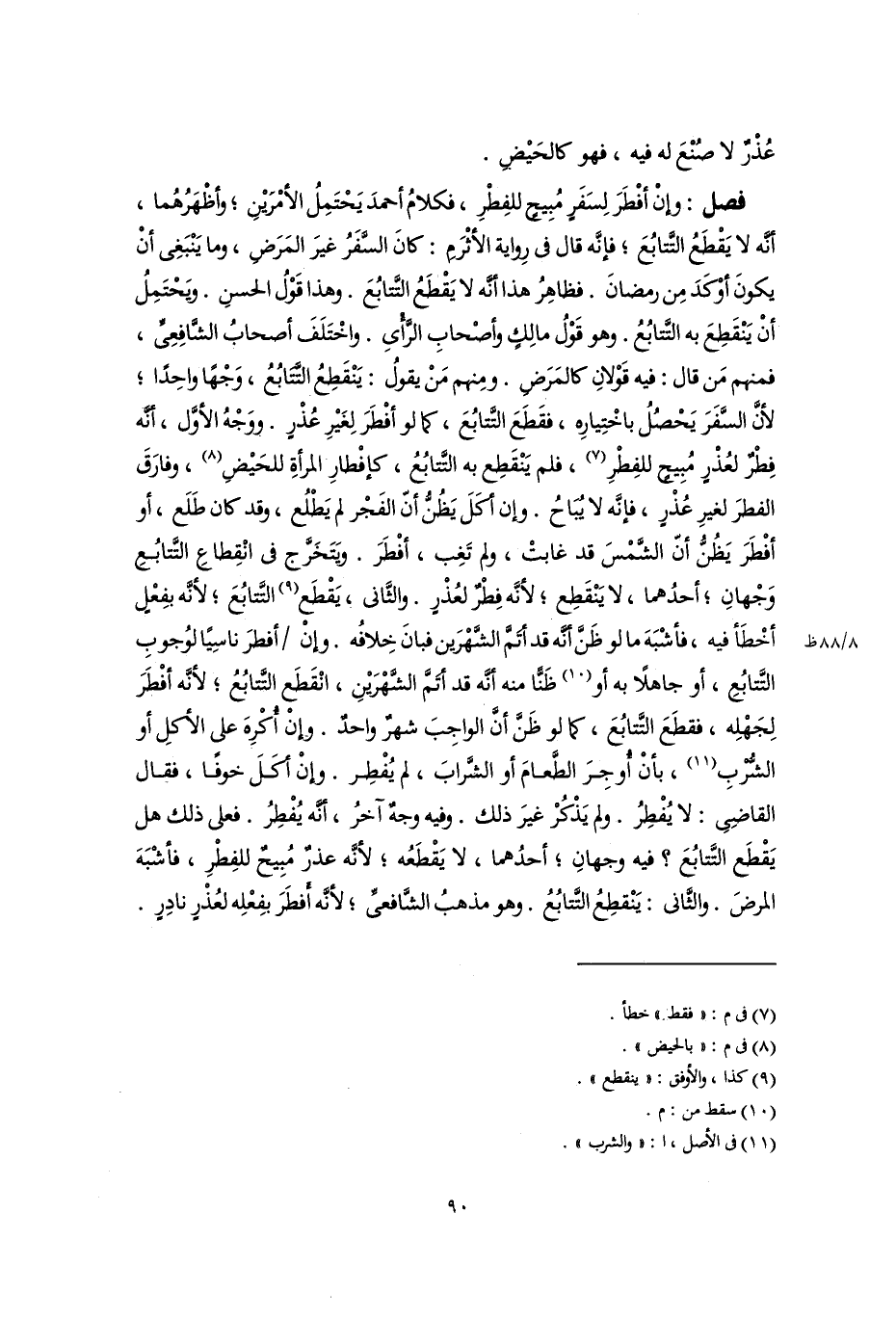 فصل: وإِنْ أفْطَرَ لِسَفَرٍ مُبِيحٍ للفِطْرِ، فكلامُ أحمدَ يَحْتَمِلُ الأمْرَيْنِ؛ وأظْهَرُهُما، أنَّه لا يَقْطَعُ التَّتابُعَ؛ فإنَّه قال فى رِواية الأثْرَمِ: كانَ السَّفَرُ غيرَ المَرَضِ، وما يَنْبَغِى أَنْ يكونَ أوْكَدَ مِن رمضانَ. فظاهِرُ هذا أنَّه لا يَقْطَعُ التَّتابُعَ. وهذا قَوْلُ الحسنِ. ويَحْتَمِلُ أَنْ يَنْقَطِعَ به التَّتابُعُ. وهو قَوْلُ مالِكٍ وأصْحابِ الرَّأْىِ. واخْتَلَفَ أصحابُ الشَّافِعِىِّ، فمنهم مَن قال: فيه قَوْلانِ كالمَرَضِ. ومِنهم مَنْ يقولُ: يَنْقَطِعُ التَّتَابُعُ، وَجْهًا واحِدًا؛ لأنَّ السَّفَرَ يَحْصُلُ باخْتِيارِه، فقَطَعَ التَّتابُعَ، كما لو أفْطَرَ لِغَيْرِ عُذْرٍ. ووَجْهُ الأوَّل، أنَّه فِطْرٌ لعُذْرٍ مُبِيحٍ للفِطْرِ (٧)، فلم يَنْقَطِع به التَّتابُعُ، كإفْطارِ المرأةِ للحَيْضِ (٨)، وفارَقَ الفطرَ لغيرِ عُذْرٍ، فإنَّه لا يُبَاحُ. وإن أكَلَ يَظُنُّ أنّ الفَجْر لم يَطْلُع، وقد كان طَلَع، أو أفْطَرَ يَظُنُّ أنّ الشَّمْسَ قد غابتْ، ولم تَغِب، أفْطَرَ. ويَتَخَرَّج فى انْقِطاعِ التَّتابُعِ وَجْهانِ؛ أحدُهما، لا يَنْقَطِع؛ لأنَّه فِطْرٌ لعُذْرٍ. والثَّانى، يَقْطع (٩) التَّتابُعَ؛ لأنَّه بفِعْلٍ أخْطَأ فيه، فأشْبَهَ ما لو ظَنَّ أنَّه قد أتَمَّ الشَّهْرَين فبانَ خِلافُه. وإِنْ أفطرَ ناسِيًا لوُجوبِ التَّتابُعِ، أو جاهلًا به أو (١٠) ظَنًّا منه أنَّه قد أتَمَّ الشَّهْرَيْنِ، انْقَطع التَّتابُعُ؛ لأنَّه أفْطَرَ لِجَهْلِه، فقطَعَ التَّتابُعَ، كما لو ظَنَّ أَنَّ الواجِبَ شهرٌ واحدٌ. وإِنْ أُكْرِهَ على الأكلِ أو الشُّرْبِ (١١)، بأنْ أُوجِرَ الطَّعامَ أو الشَّرابَ، لم يُفْطِر. وإِنْ أكَلَ خوفًا، فقال القاضِىِ: لا يُفْطِرُ. ولم يَذْكُرْ غيرَ ذلك. وفيه وجهٌ آخرُ، أنَّه يُفْطِرُ. فعلى ذلك هل يَقْطَع التَّتابُعَ؟ فيه وجهانِ؛ أحدُهما، لا يَقْطَعُه؛ لأنَّه عذرٌ مُبِيحٌ للفِطْرِ، فأشْبَهَ المرضَ. والثَّانى: يَنْقطِعُ التَّتابُعُ. وهو مذهبُ الشَّافعىِّ؛ لأنَّه أَفطَرَ بفِعْلِه لعُذْرٍ نادِرٍ.
