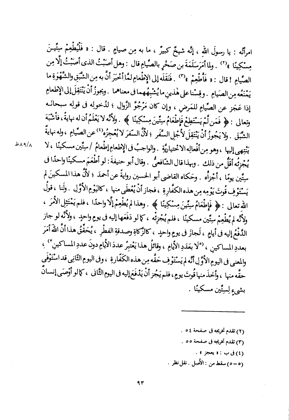 امرأتُه: يا رسولَ اللَّهِ، إنَّه شيخٌ كبيرٌ، ما به مِن صيامٍ. قال: "فَلْيُطْعِمْ سِتِّينَ مِسْكِينًا" (٢). ولما أمَرَ سَلَمَةَ بن صَخْرٍ بالصِّيامِ قال: وهل أصَبْتُ الذى أصَبْتُ إلَّا مِن الصِّيامِ! قال: "فَأَطْعِمْ" (٣). فَنَقَلَه إلى الإِطْعامِ لمَّا أخْبَرَ أَنَّ به مِن الشَّبَقَ والشَّهْوَةِ ما يَمْنَعُه مِن الصِّيامِ. وقِسْنا على هذينِ ما يُشْبِهُهما فى معناهما. ويجوزُ أَنْ يَنْتَقِلَ إلى الإِطعامِ إذا عَجَز عن الصَّيامِ للمَرضِ، وإن كان مَرْجُوَّ الزَّوالِ؛ لدُخولِه فى قولِه سبحانَه وتعالى: {فَمَنْ لَمْ يَسْتَطِعْ فَإِطْعَامُ سِتِّينَ مِسْكِينًا}. ولأنَّه لا يَعْلَمُ أن له نهايةً، فأشْبَهَ الشَّبَقَ. ولا يَخوزُ أَنْ يَنْتَقِلَ لأجْلِ السَّفَر؛ لأنَّ السّفرَ لا يُعْجِزُه (٤) عن الصِّيامِ، وله نهايةٌ يَنْتِهى إليها، وهو مِن أفْعالِه الاخْتياريَّةِ. والواجبُ فى الإِطعامِ إطْعامُ سِتِّين مسكينًا، لا يُجْزِئُه أقَلُّ من ذلك. وبهذا قال الشّافعىُّ. وقال أبو حنيفةَ: لو أطْعَمَ مسكينًا واحدًا فى سِتَّين يومًا، أجْزأَه. وحَكاه القاضى أبو الحسين روايةً عن أحمدَ؛ لأنَّ هذا المسكينَ لم يَسْتَوْفِ قُوتَ يَوْمِه مِن هذه الكفَّارِةِ، فجاز أَنْ يُعْطَى منها، كاليَوْمِ الأوَّلِ. وَلنا، قولُ اللَّه تعالى: {فَإِطْعَامُ سِتِّينَ مِسْكِينًا}. وهذا لم يُطْعِمْ إلَّا واحدًا، فلم يَمْتَثِلِ الأمرَ، ولأنَّه لم يُطْعِمْ سِتِّين مسكينًا، فلم يُجْزِئْه، كما لو دَفَعَها إليه فى يومٍ واحدٍ، ولأنَّه لو جاز الدَّفْعُ إليه فى أيامٍ، لَجازَ فى يومٍ واحدٍ، كالزَّكاةِ وصدقةِ الفطْرِ، يُحَقَّقُ هذا أَنَّ اللَّهَ أمَرَ بعددِ المساكينِ، [لَا بعَدَدِ الأيامِ، وقائلُ هذا يَعْتبِرُ عددَ الأيامِ دونَ عددِ المساكينِ] (٥)، والمعنى فى اليومِ الأوَّلِ أنَّه لم يَسْتَوْفِ حَقَّه مِن هذه الكَفّارةِ، وفى اليومِ الثّانِى قد اسْتَوْفَى حقَّه منها، وأخَذَ منها قُوتَ يومٍ، فلم يَجُز أَنْ يَدْفَعَ إليه فى اليوم الثَّانى، كما لو أوْصَى إنسانٌ بشىءٍ لِسِتِّين مسكينًا.