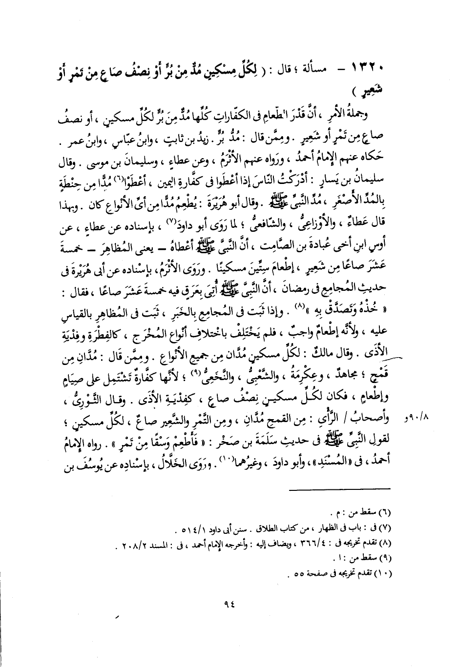 ١٣٢٠ - مسألة؛ قال: (لِكُلِّ مِسْكِينٍ مُدٌّ مِنْ بُرٍّ أَوْ نِصْفُ صَاعٍ مِنْ تَمْرٍ أَوْ شَعِيرٍ)
