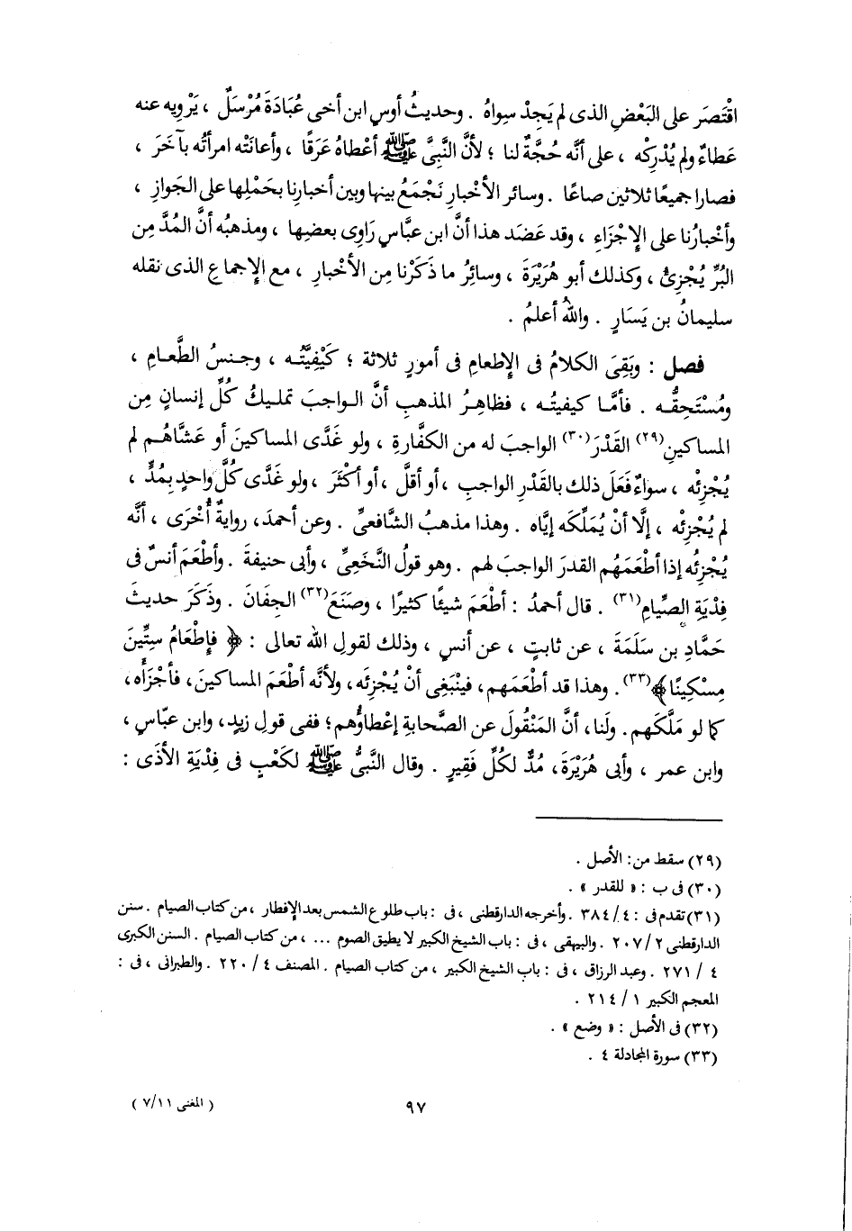 فصل: وبَقِىَ الكلامُ فى الإِطعامِ فى أمورٍ ثلاثة؛ كَيْفِيَّتُه، وجنسُ الطَّعامِ، ومُسْتَحِقُّه. فأمَّا كيفيتُه، فظاهِرُ المذهبِ أَنَّ الواجبَ تمليكُ كُلِّ إنسانٍ مِن المساكينِ (٢٩) القَدْرَ (٣٠) الواجبَ له من الكفَّارةِ، ولو غَدَّى الساكينَ أو عَشَّاهُم لم يُجْزِئْه، سواءٌ فَعَلَ ذلك بالقَدْرِ الواجبِ، أو أقلَّ، أو أكْثَرَ، ولو غَدَّى كُلِّ واحدٍ بِمُدٍّ، لم يُجْزِئْه، إلَّا أَنْ يُمَلكَه إيَّاه. وهذا مذهبُ الشَّافعىِّ. وعن أحمدَ، رواية أُخْرَى، أنَّه يُجْزِئُه إذا أطْعَمَهُم القدرَ الواجبَ لهم. وهو قولُ النَّخَعِىِّ، وأبى حنيفةَ. وأطْعَمَ أنسٌ فى فِدْيَةِ الصِّيامِ (٣١). قال أحمدُ: أطْعَمَ شيئًا كثيرًا، وصَنَع (٣٢) الجِفَانَ. وذَكَرَ حديثَ حَمَّادِ بن سَلَمَةَ، عن ثابتٍ، عن أنسٍ، وذلك لقولِ اللَّه تعالى: {فَإِطْعَامُ سِتِّينَ مِسْكِينًا} (٣٣). وهذا قد أطْعَمَهم، فينْبَغِى أَنْ يُجْزِئَه، ولأنَّه أطْعَمَ المساكينَ، فأجْزَأَه، كما لو مَلَّكَهم. ولَنا، أَنَّ المَنْقُولَ عن الصَّحابةِ إعْطاوُّهم؛ ففى قولِ زيدٍ، وابن عبّاسٍ، وابن عمر، وأبى هُرَيْرَةَ، مُدٌّ لكُلِّ فَقِيرٍ. وقال النَّبىُّ -صلى اللَّه عليه وسلم- لكَعْبٍ فى فِدْيَةِ الأذَى: