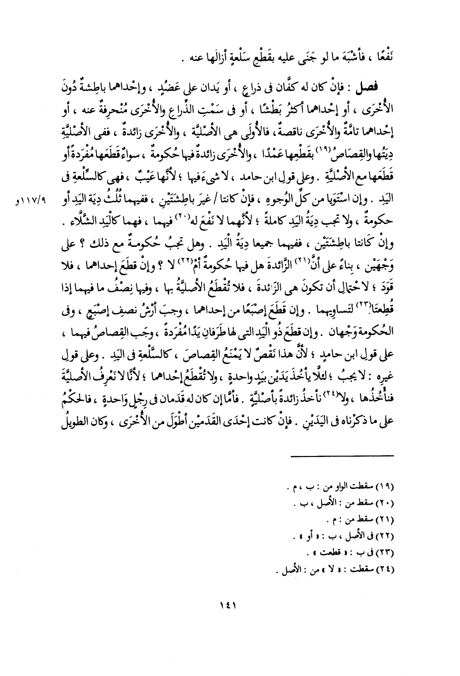 فصل: فإنْ كان له كفَّان في ذراعٍ، أو يَدان على عَضُدٍ، وإحْداهما باطِشةٌ دُونَ الأُخْرَى، أو إحْداهما أكثرُ بَطْشًا، أو في سَمْتِ الذِّراعِ والأُخْرَى مُنْحرِفةٌ عنه، أو إحْداهما تامَّةٌ والأُخْرَى ناقصةٌ، فالأُولَى هي الأصْليَّة، والأُخْرَى زائدةٌ، ففى الأصْليَّةِ دِيَتُها والقِصَاصُ (١٩) بقَطْعِها عَمْدًا، والأُخْرَى زائدةٌ فيها حُكومةٌ، سواءٌ قَطَعَها مُفْرَدةً أو قَطَعَها مع الأصْليَّةِ. وعلى قولِ ابن حامد، لا شىءَ فيها؛ لأنَّها عَيْبٌ، فهى كالسِّلْعةِ في اليَدِ. وإن اسْتَوَيا من كلِّ الوُجوهِ، فإنْ كانتا غيرَ باطِشَتَيْنِ، ففيهما ثُلُثُ دِيَة اليَدِ أو حكومةٌ، ولا تجب دِيَةُ اليَدِ كاملةً؛ لأنَّهما لا نَفْعَ له (٢٠) فيهما، فهما كالْيَدِ الشَّلَّاء. وإنْ كَانتا باطِشَتَيْن، ففيهما جميعا دِيَةُ الْيَدِ. وهل تجبُ حُكومةٌ مع ذلك؟ على وَجْهَيْن، بِناءً على أنَّ (٢١) الزَّائدةَ هل فيها حُكومةٌ أمْ (٢٢) لا؟ وإنْ قطَعَ إحداهما، فلا قَوَدَ؛ لاحْتمالِ أن تكونَ هي الزّائدةَ، فلا تُقْطَعُ الأصليَّةُ بها، وفيها نِصْفُ ما فيهما إذا قُطِعتَا (٢٣) لتَساوِيهما. وإن قَطَعَ إصْبَعًا من إحداهما، وجبَ أرْشُ نصفِ إصْبَعٍ، وفى الحُكومة وَجْهان. وإن قطَعَ ذُو الْيَدِ التي لها طَرَفانِ يَدًا مُفْرَدةً، وجَب القِصاصُ فيهما، على قولِ ابن حامدٍ؛ لأنَّ هذا نَقْصٌ لا يَمْنَعُ القِصاصَ، كالسَّلْعةِ في اليَدِ. وعلى قولِ غيرِه: لا يجبُ؛ لئلَّا يأخُذَ يَدَيْن بيَدٍ واحدةٍ، ولا تُقْطَعُ إحْداهما؛ لأنَّا لا نَعْرِفُ الأصليَّةَ فنأْخُذُها، ولا (٢٤) نأخذُ زائدةً بأصْليَّةٍ. فأمَّا إن كان له. قَدَمان في رِجْلٍ وَاحدةٍ، فالحكْمُ على ما ذكرْناه في اليَدَيْنِ. فإنْ كانت إحْدَى القَدَميْن أطْوَلَ من الأُخْرَى، وكان الطويلُ