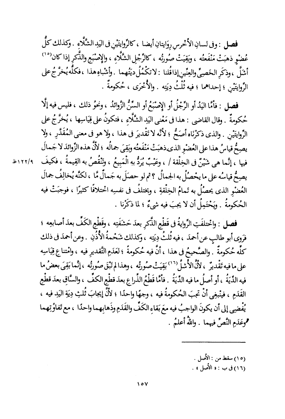 فصل: واخْتلفَتِ الرِّوايةُ في قَطْعِ الذَّكرِ بعدَ حَشَفَتِه، وقَطْعِ الكَفِّ بعدَ أصابعِه؛ فرَوى أبو طالبٍ عن أحمدَ، فيه ثُلثُ دِيَتِه، وكذلك شَحْمةُ الأُذُنِ. وعن أحمدَ في ذلك كلِّه حُكومةٌ. والصَّحيحُ في هذا، أنَّ فيه حُكومةً؛ لعَدَمِ التَّقديرِ فيه، وامْتناعِ قِيَاسِه على ما فيه تَقْديرٌ، لأنَّ الأَشلَّ (١٦) بَقِيَتْ صُورتُه، وهذا لم تَبْقَ صُورتُه، إنَّما بَقِيَ بعضُ ما فيه الدِّيَةُ، أو أصلُ ما فيه الدِّيَةُ. فأمَّا قَطْعُ الذِّراعِ بعدَ قطْعِ الكفِّ، والسَّاقِ بعدَ قطْعِ القَدَمِ، فينْبغِى أنْ تجبَ الحُكومةُ فيه، وجهًا واحدًا؛ لأنَّ إيجابَ ثُلثِ دِيَةِ اليَدِ فيه، يُفْضِي إلى أن يكونَ الواجبُ فيه معَ بَقاءِ الكَفِّ والقَدَمِ وذَهابِهما واحدًا، مع تَفاوُتِهما وعَدَمِ النَّصِّ فيهما. واللهُ أعلمُ.