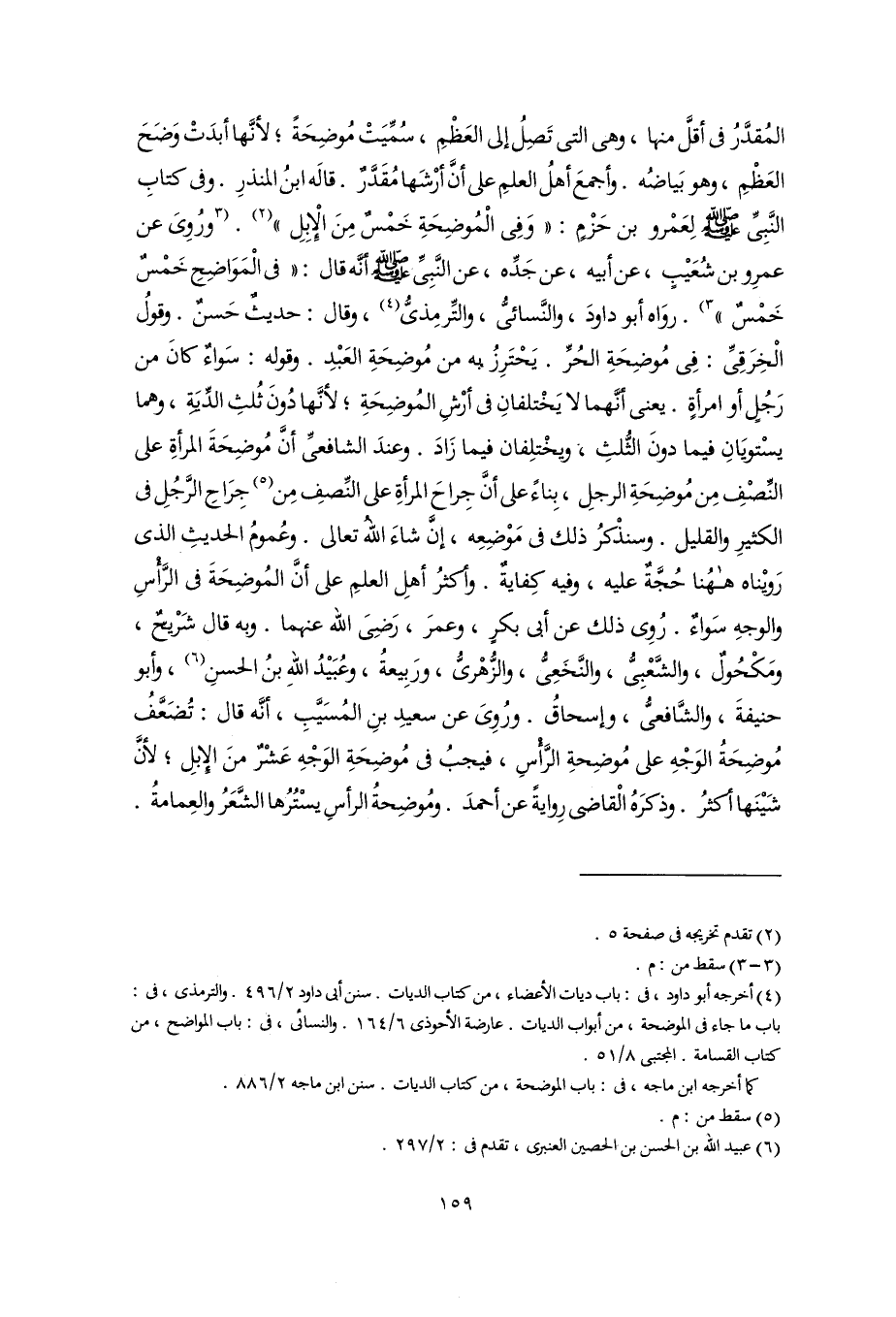 المُقدَّرُ في أقلَّ منها، وهي التي تَصِلُ إلى العَظْمِ، سُمِّيَتْ مُوضِحَةً؛ لأنَّها أبدَتْ وَضَحَ العَظْمِ، وهو بَياضُه. وأجمعَ أهلُ العلمِ على أنَّ أرْشَها مُقَدَّرٌ. قالَه ابنُ المنذرِ. وفي كتابِ النَّبِيِّ -صلى اللَّه عليه وسلم- لِعَمْرو بن حَزْمٍ: "وَفِي الْمُوضِحَةِ خَمْسٌ مِنَ الإِبلِ" (٢). [ورُوِيَ عن عمرِو بن شُعَيْبٍ، عن أبيه، عن جَدِّه، عن النَّبِيِّ -صلى اللَّه عليه وسلم- أنَّه قال: "في الْمَوَاضِحِ خَمْسٌ خَمْسٌ"] (٣). روَاه أبو داودَ، والنَّسائيُّ، والتِّرمِذيُّ (٤)، وقال: حديثٌ حَسنٌ. وقولُ الْخِرَقِيِّ: فِي مُوضِحَةِ الحُرِّ. يَحْتَرِزُ به من مُوضِحَةِ العَبْدِ. وقوله: سَواءٌ كانَ من رَجُلٍ أو امرأةٍ. يعني أنَّهما لا يَخْتلفانِ في أرْشِ المُوضِحَةِ؛ لأنَّها دُونَ ثُلثِ الدِّيَةِ، وهما يسْتويَانِ فيما دونَ الثُّلثِ، ويخْتلِفان فيما زَادَ. وعندَ الشافعيِّ أنَّ مُوضِحَةَ المرأةِ على النِّصْفِ مِن مُوضِحَةِ الرجلِ، بِناءً على أنَّ جِراحَ المرأةِ على النِّصفِ مِن (٥) جِرَاحِ الرَّجُلِ في الكثيرِ والقليل. وسنذْكرُ ذلك في مَوْضِعِه، إن شاءَ اللهُ تعالى. وعُمومُ الحديثِ الذي رَويْناه ههُنا حُجَّةٌ عليه، وفيه كِفايةٌ. أكثرُ أهلِ العلمِ على أنَّ المُوضِحَةَ في الرَّأْسِ والوجهِ سَواءٌ. رُوِى ذلك عن أبي بكرٍ، وعمرَ، رَضِيَ اللَّه عنهما. وبه قال شَريْحٌ، ومَكْحُولٌ، والشَّعْبِيُّ، والنَّخَعِيُّ، والزُّهْريُّ، ورَبِيعةُ، وعُبَيْدُ اللهِ بنُ الحسنِ (٦)، وأبو حنيفةَ، والشَّافعيُّ، وإسحاقُ. ورُوِيَ عن سعيدِ بنِ المُسَيَّبِ، أنَّه قال: تُضَعَّفُ مُوضِحَةُ الوَجْهِ على مُوضِحةِ الرَّأْسِ، فيجبُ في مُوضِحَةِ الوَجْهِ عَشْرٌ منَ الإِبلِ؛ لأنَّ شَيْنَها أكثرُ. وذكرَهُ الْقاضي رِوايةً عن أحمدَ. ومُوضِحةُ الرأسِ يسْتُرُها الشَّعَرُ والعِمامةُ.