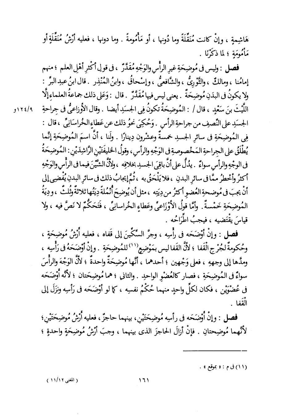 فصل: وليس في مُوضِحَةِ غيرِ الرأْسِ والوَجْهِ مُقَدَّرٌ، في قولِ أكْثرِ أهْلِ العلم؛ منهم إمامُنا، ومالكٌ، والثَّوْرِيُّ، والشَّافعيُّ، وإسْحاقُ، وابنُ المُنْذِر. قال ابنُ عبدِ البرِّ: ولا يكونُ في البدَنِ مُوضِحَةٌ. يعني ليس فيها مُقَدَّرٌ. قال: وَعَلى ذلك جاعةُ العلماءِ إلَّا اللَّيْثَ بنَ سَعْدٍ، قال: المُوضِحَةُ تكونُ فِي الجسَدِ أيضًا. وقال الأوزاعيُّ في جِراحةِ الجسَدِ على النِّصفِ من جراحةِ الرأسِ. وَحُكِيَ نحوُ ذلك عن عَطاءٍ الخُراسَانِيِّ، قال: فِي المُوضِحَةِ في سائرِ الجسدِ خمسةٌ وعشْرون دِينارًا. ولَنا، أنَّ اسمَ المُوضِحَةِ إنَّما يُطْلَقُ على الجِراحةِ المَخْصوصةِ في الوَجْهِ والرأسِ، وقولُ الخليفَتَيْنِ الرَّاشِدَيْنِ: المُوضِحَةُ في الوجْهِ والرأسِ سواءٌ. يدُلُّ على أنَّ باقِيَ الجسدِ بخلافِه، ولأنَّ الشَّيْنَ فيما في الرأْسِ والوَجْهِ أكثرُ وأخْطرُ ممَّا في سائرِ البدنِ، فلا يَلْحَقُ به، ثُمَّ إيجابُ ذلك في سائرِ البدنِ يُفْضِي إلى أنْ يجبَ في مُوضحةِ العُضوِ أكثرُ من دِيَتِه، مثل أن يُوضِحَ أُنْمُلةً دِيَتُها ثلاثةٌ وثُلثٌ، ودِيَةُ المُوضِحَةِ خَمْسةٌ. وأمَّا قولُ الأوْزَاعيِّ وعَطاءٍ الخُراسانِيِّ، فَتَحَكُّمٌ لا نَصَّ فيه، ولا قياسَ يقْتَضيه، فيجبُ اطِّرَاحُه.
