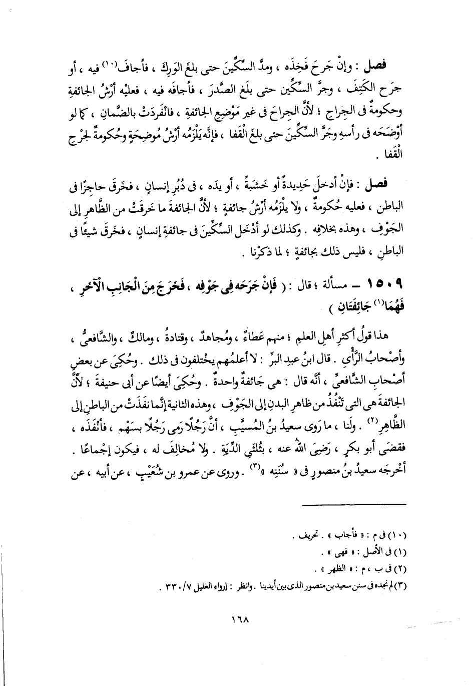 ١٥٠٩ - مسألة؛ قال: (فَإنْ جَرَحَه فِي جَوْفِه، فَخَرَجَ مِنَ الْجَانِبِ الْآخَرِ، فَهُمَا (١) جَائِفَتَانِ)