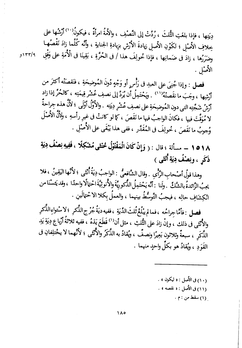 فصل: وإذا جُنِيَ على العبدِ في رَأْسٍ أو وَجْهٍ دُونَ المُوضِحَةِ، فنَقصَتْه أكثرَ من أرْشِها، وجَبَ ما نقَصتْهُ (١١). ويَحْتَمِلُ أن يُرَدَّ إلى نصفِ عُشْر قِيمَتِه، كالحُرِّ إذا زاد أرْشُ شَجَّتِه التي دون المُوضِحَةِ على نصفِ عُشْرِ دِيَتِه. والأوَّلُ أوْلَى؛ لأنَّ هذه جِراحةٌ لا مُوَقَّتَ فيها، فكانَ الواجبُ فيها ما نَقَصَ، كما لو كانتْ في غيرِ رأسهِ، ولأنَّ الأصْلَ وُجوبُ ما نَقَصَ، خُولِفَ في المُقَدَّر، ففى هذا يَبْقَى على الأَصْلِ.
