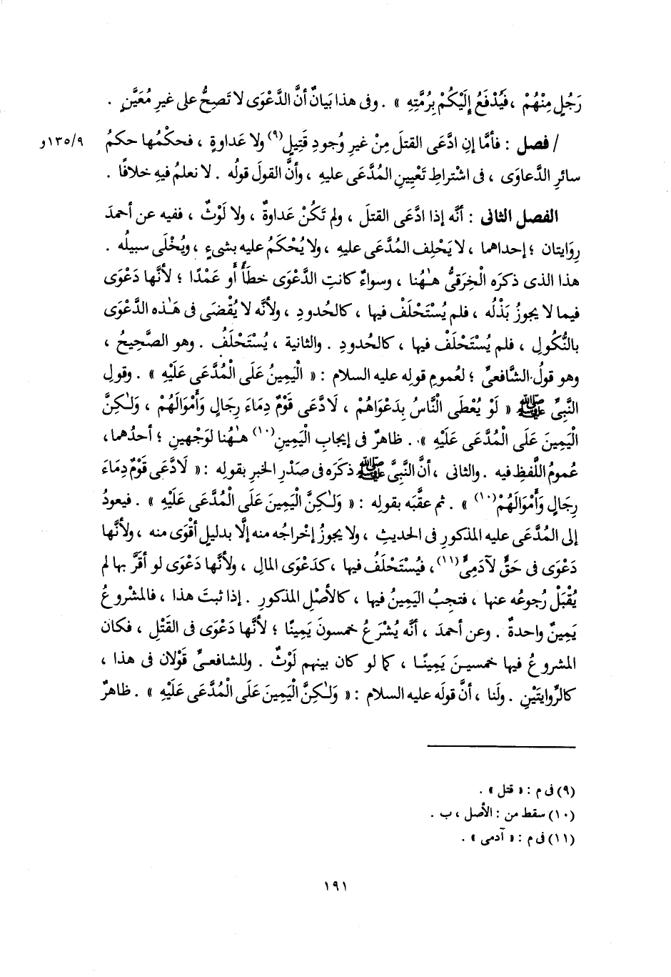 الفصل الثاني: أنَّه إذا ادَّعَى القتلَ، ولم تَكُنْ عَداوةٌ، ولا لَوْثٌ، ففيه عن أحمدَ رِوَايتان؛ إحداهما، لا يَحْلِف المُدَّعَى عليهِ، ولا يُحْكَمُ عليه بشيءٍ، ويُخْلَى سبيلُه. هذا الذي ذكرَه الْخِرَقِيُّ ههُنا، وسواءٌ كانتِ الدَّعْوَى خطَأً أو عَمْدًا؛ لأنَّها دَعْوَى فيما لا يجوزُ بَذْلُه، فلم يُسْتَحْلَفْ فيها، كالحُدودِ، ولأنَّه لا يُقْضَى في هَذه الدَّعْوَى بالنُّكُولِ، فلم يُسْتَحْلَفْ فيها، كالحُدودِ. والثانية، يُسْتَحْلَفُ. وهو الصَّحِيحُ، وهو قولُ الشَّافعيِّ؛ لعُمومِ قولِه عليه السلام: "الْيَمِينُ عَلَى الْمُدَّعَى عَلَيْهِ". وقولِ النَّبِيِّ -صلى اللَّه عليه وسلم- "لَوْ يُعْطَى الْنَّاسُ بِدَعْوَاهُمْ، لَادَّعَى قَوْمٌ دِمَاءَ رِجَالٍ وَأمْوَالَهُمْ، وَلكِنَّ الْيَمِينَ عَلَى الْمُدَّعَى عَلَيْهِ". ظاهرٌ في إيجابِ الْيَمِينِ [ههُنا لوَجْهينِ؛ أحدُهما، عُمومُ اللَّفظِ فيه. والثاني، أنَّ النَّبِيَّ -صلى اللَّه عليه وسلم- ذكَرَه في صَدْرِ الخبرِ بقولِه: "لَادَّعى قَوْمٌ دِمَاءَ رِجَالٍ وَأَمْوَالَهُمْ] (١٠) ". ثم عقَّبَه بقولِه: "وَلكِنَّ الْيَمِينَ عَلَى الْمُدعَى عَلَيْهِ". فيعودُ إلى المُدَّعَى عليه المذكورِ في الحديثِ، ولا يجوزُ إخْراجُه منه إلَّا بدليلٍ أقْوَى منه، ولأنَّها دَعْوَى في حَقٍّ لآدَمِيٍّ (١١)، فيُسْتَحْلَفُ فيها، كدَعْوَى المالِ، ولأنَّها دَعْوَى لو أقَرَّ بها لم يُقْبَلْ رُجوعُه عنها، فتجِبُ اليَمِينُ فيها، كالأصْلِ المذكورِ. إذا ثبتَ هذا، فالمشْروعُ يَمِينٌ واحدةٌ. وعن أحمدَ، أنَّه يُشْرَعُ خمسونَ يَمِينًا؛ لأنَّها دَعْوَى في القَتْلِ، فكان المشروعُ فيها خمسينَ يَمِينًا، كما لو كان بينهم لَوْثٌ. وللشافعىِّ قَوْلان في هذا، كالرِّوايتَيْنِ. ولَنا، أنَّ قولَه عليه السلام: "وَلكِنَّ الْيَمِينَ عَلَى الْمُدَّعَى عَلَيْهِ". ظاهرٌ