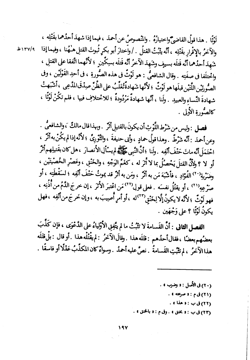 فصل: وليس من شَرْط اللَّوْثِ أن يكونَ بالقتيلِ أثَرٌ. وبهذا قال مالكٌ، والشافعيُّ. وعن أحمدَ: أنَّه شَرْطٌ. وهذا قولُ حمادٍ، وأبي حنيفةَ، والثَّوْرِيِّ؛ لأنَّه إذا لم يكُنْ به أثَرٌ، احْتَمَلَ أنَّه ماتَ حَتْفَ أنْفِه. ولَنا؛ أنَّ النَّبِي -صلى اللَّه عليه وسلم- لم يسْألِ الأنصارَ، هل كان بقَتيلِهم أثرٌ أو لا؟ ولأنَّ القتلَ يَحْصُلُ بما لا أَثرَ له، كغَمِّ الوَجْهِ، والخَنْقِ، وعَصْرِ الخُصْيتَيْن، وضَرْبةِ (٢٠) الفُؤادِ، فأشْبَهَ مَن به أثَرٌ، ومَن به أثرٌ قد يموتُ حَتْفَ أنْفِه؛ لسَقْطَتِه، أو صَرْعِهِ (٢١)، أو يقتُلُ نفسَه. فعلى قولِ (٢٢) مَن اعْتبرَ الأثرَ، إن خرجَ الدَّمُ من أُذُنِه، فهو لَوْثٌ؛ لأنَّه لا يكونُ إلَّا لِخَنْقٍ (٢٣) له، أو أمرٍ أُصِيبَ به، وإن خَرجَ من أنْفِه، فهل يكونُ لَوْثًا؟ على وَجْهَين.