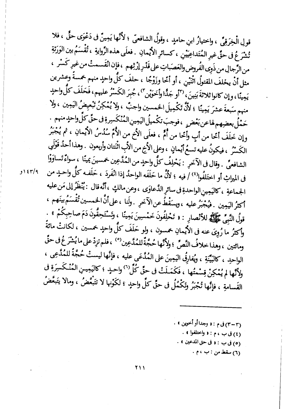 قولِ الْخِرَقِيِّ، واختيارُ ابنِ حامدٍ، وقولُ الشافعيّ؛ لأنَّها يَمِينٌ في دَعْوَى حقٍّ، فلا تُشْرَعُ في حقِّ غيرِ المُتَداعِيَيْنِ، كسائرِ الأيْمانِ. فعلَى هذه الرِّوايةِ، تُقْسَمُ بين الوَرَثةِ من الرِّجالِ من ذَوِى الفُروض والعَصَباتِ على قَدْرِ إرْثِهم، فإن انْقَسمتْ من غيرِ كَسْر، مثل أنْ يخلفَ المقتولُ اثْنَيْنِ، أو أخًا وزَوْجًا، حلفَ كلُّ واحدٍ منهم خمسةً وعشرين يَمِينًا، وإن كانوا ثلاثةَ بَنِينَ، [أو جَدًّا وأخَوَيْن] (٣)، جُبِرَ الكَسْرُ عليهم، فَحَلَفَ كلُّ واحدٍ منهم سَبعةَ عشرَ يَمِينًا؛ لأنَّ تَكْمِيلَ الخمسين واجبٌ، ولا يُمْكِنُ تَبْعِيضُ اليَمِين، ولا حَمْلُ بعضِهم لها عن بَعْضٍ، فوجبَ تكْميلُ اليَمِينِ المُنْكَسِرةِ في حقِّ كلِّ واحدٍ منهم. وإن خَلَفَ أخًا من أبٍ وأخًا من أُمٍّ، فعلَى الأخ من الأُمِّ سُدُسُ الأيْمانِ، ثم يُجْبَرُ الكَسْرُ، فيكونُ عليه تسعُ أيْمانٍ، وعلى الأخِ من الأبِ اثْنَتان وأربعون. وهذا أحدُ قَوْلَيِ الشافعيِّ. وقال في الآخَرِ: يَحْلِفُ كلُّ واحدٍ من المُدَّعِين خمسينَ يمينًا، سواءٌ تَساوَوْا في الميراثِ أو اختَلفُوا (٤) فيه؛ لأنَّ ما حَلَفَه الواحدُ إذا انْفَردَ، حَلَفه كلُّ واحدٍ من الجماعةِ، كاليَمِينِ الواحدةِ في سائرِ الدَّعاوَى، وعن مالكٍ، أنَّه قال: يُنْظَرُ إلى مَن عليه أكثرُ اليَمِين. فيُجْبَرُ عليه، ويَسْقطُ عن الآخَرِ. ولَنا، على أنَّ الخمسين تُقْسَمُ بينَهم، قولُ النَّبِيِّ -صلى اللَّه عليه وسلم- للأنْصارِ: "تَحْلِفُونَ خَمْسِينَ يَمِينًا، وتَسْتَحِقُّونَ دَمَ صاحِبِكُمْ". وأكثرُ ما رُوِيَ عنه في الأيْمانِ خمسون، ولو حَلَفَ كلُّ واحدٍ خمسين، لكانتْ مائةً ومائتين، وهذا خلاف النَّصِّ؛ ولأنَّها حُجَّةٌ للمُدَّعِين (٥)، فلم تزِدْ على ما يُشْرَعُ في حقِّ الواحدِ، كالبَيِّنَةِ، ويُفارِقُ اليَمِينَ على المُدَّعَى عليه، فإنَّها ليستْ حُجَّةً للمُدَّعِي، ولأنَّها لم يُمْكِنْ قِسْمتُها، فَكَمَلَتْ في حقِّ كُلِّ (٦) واحدٍ؛ كاليَمِينِ المُنْكَسِرَةِ في القَسامةِ، فإنَّها تُجْبَرُ وتَكْمُلُ في حقِّ كلِّ واحدٍ؛ لكَوْنها لا تتَبعَّضُ، وما لا يتَبعَّضُ