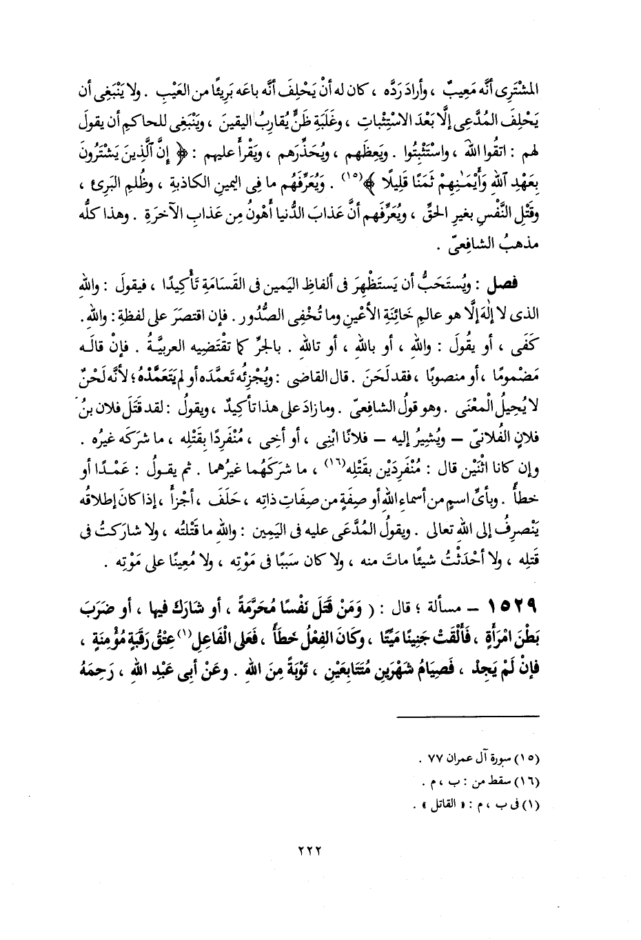 المشْتَرِي أنَّه مَعِيبٌ، وأرادَ رَدَّه، كان له أنْ يَحْلِفَ أنَّه باعَه بَرِيئًا من العَيْبِ. ولا يَنْبَغِي أن يَحْلِفَ المُدَّعِي إلَّا بَعْدَ الاسْتِثْباتِ، وغَلَبَةِ ظَنٍّ يُقارِبُ اليقينَ، ويَنْبَغِي للحاكمِ أن يقولَ لهم: اتقُوا اللهَ، واسْتَثْبِتُوا. ويَعِظَهم، ويُحَذِّرَهم، ويَقْرأَ عليهم: {إِنَّ الَّذِينَ يَشْتَرُونَ بِعَهْدِ اللَّهِ وَأَيْمَانِهِمْ ثَمَنًا قَلِيلًا} (١٥). وَيُعَرِّفَهُم ما فِي اليمينِ الكاذبةِ، وظُلمِ البَرِيء، وقَتْلِ النَّفْس بغيرِ الحقِّ، ويُعَرِّفَهم أنَّ عَذابَ الدُّنيا أَهْونُ مِن عَذابِ الآخرَةِ. وهذا كلُّه مذهبُ الشافِعيّ.