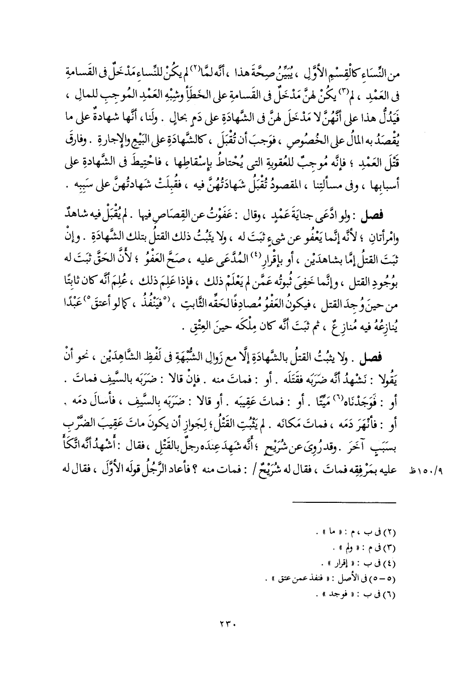 فصل: ولا يثبُتُ القتلُ بالشَّهادَةِ إلَّا مع زَوالِ الشُّبْهَةِ في لَفْظِ الشَّاهِدَيْن، نحو أنْ يَقُولا: نَشْهدُ أنَّه ضَرَبَه فقَتَلَه. أو: فماتَ منه. فإنْ قالا: ضَرَبَه بالسَّيفِ فماتَ. أو: فَوَجَدْنَاه (٦) مَيِّتًا. أو: فماتَ عَقِيبَه. أو قالا: ضَرَبَه بِالسَّيفِ، فأسالَ دمَه، أو: فأنْهَرَ دَمَه، فماتَ مَكانَه. لم يَثْبُتِ القَتْلُ؛ لِجَوازِ أن يكونَ ماتَ عَقِيبَ الضَّرْبِ بسَبَبٍ آخَرَ. وقد رُوِيَ عن شُرَيْحٍ؛ أنَّه شَهِدَ عِندَه رجلٌ بالقَتْلِ، فقال: أَشْهدُ أنَّه اتَّكَأَ عليه بمَرْفِقِه فماتَ، فقال له شُرَيْحٌ: فمات منه؟ فأعاد الرَّجُلُ قولَه الأوَّلَ، فقال له