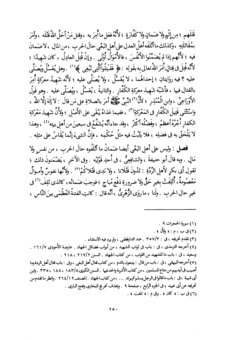 فصل: وليس على أهلِ البَغْيِ أيضًا ضَمانُ ما أتْلَفُوه حالَ الحربِ، من نفسٍ ولا مَالٍ. وبه قالَ أبو حنيفةَ، والشافِعِيُّ، في أَحدِ قَوْليْه. وفي الآخَرِ، يَضْمَنونَ ذلك؛ لقولِ أبي بكرٍ لأهلِ الرِّدَّةِ: تَدُونَ قَتْلَانا، ولا نَدِي قَتْلاكُمْ (٥). ولأنَّها نفوسٌ وأموالٌ مَعْصُومةٌ، أُتْلِفَتْ بِغيرِ حَقٍّ ولا ضرورةِ دَفْعِ مُباحٍ؛ فوجبَ ضَمانُه، كالذي تَلِفَ (٦) في غيرِ حالِ الحربِ. ولَنا، ما روَى الزُّهْرِيُّ، أنَّه قال: كانتِ الفتنةُ العُظْمَى بينَ النَّاسِ،