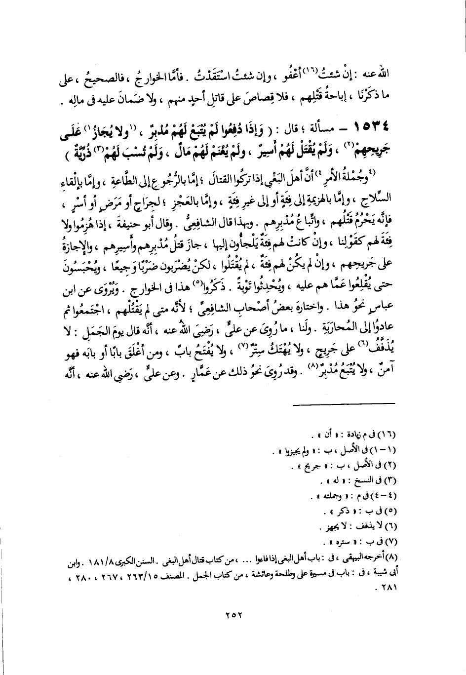 (٨) أخرجه البيهقي، في: باب أهل البغي إذا فاءوا. . ., من كتاب قتال أهل البغي، السنن الكبرى ٨/ ١٨١. وابن أبي شيبة، في: باب في مسيرة علي وطلحة وعائشة، من كتاب الجمل. المصنف ١٥/ ٢٦٣، ٢٦٧، ٢٨٠، ٢٨١.