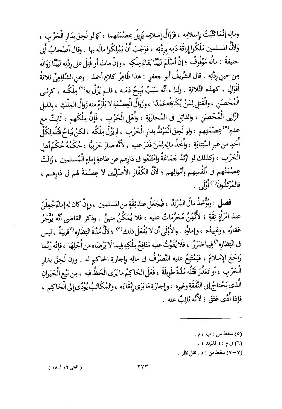 ومالِه إنَّمَا تَثْبُتُ بإسلامِه، فزَوَالُ إِسلامِه يُزِيلُ عِصْمَتَهما، كما لو لَحِقَ بِدَارِ الْحَرْبِ، وَلأنَّ المسلمين مَلَكُوا إِراقَةَ دَمِه بِرِدَّتِه، فوَجَبَ أَنْ يَمْلِكُوا مالَه بها. وقال أصْحابُ أَبى حنيفةَ: مالُه مَوْقُوفٌ؛ إنْ أسْلَمَ تَبَيَّنَّا بَقاءَ مِلْكِه، وإنْ ماتَ أو قُتِلَ على رِدَّتِه تَبَيَّنَّا زَوَالَه مِن حينِ رِدَّتِه. قال الشَّريفُ أبو جعفرٍ: هذا ظَاهِرُ كلامِ أحمدَ. وعنِ الشَّافِعِىِّ ثلاثةُ أقْوَالٍ، كهذه الثَّلاثةِ. ولَنا، أنَّه سَبَبٌ يُبِيحُ دَمَه، فلم يَزُلْ به (٥) مِلْكُه، كزِنَى الْمُحْصَنِ، والْقَتلِ لِمَنْ يُكَافِئُه عَمْدًا، وزَوالُ الْعِصْمَةِ لا يَلْزَمُ منه زَوالُ المِلْكِ، بِدَليلِ الزَّانِى المُحْصَنِ، والقاتِلِ في المُحارَبَةِ، وأَهْلِ الْحَرْبِ، فَإنَّ مِلْكَهم، ثَابِتٌ مع عدمِ (٥) عِصْمَتِهم، ولو لَحِقَ الْمُرْتَدُّ بدارِ الْحَرْبِ، لم يَزُلْ مِلْكُه، لكنْ يُباحُ قَتْلُه لِكُلِّ أَحَدٍ من غيرِ اسْتِتابَةٍ، وأَخْذُ مالِه لِمَنْ قَدَرَ عليه، لأنَّه صارَ حَرْبِيًّا، حُكْمُهُ حُكْمُ أهلِ الْحَرْبِ، وكذلك لو ارْتَدَّ جَمَاعَةٌ وامْتَنَعُوا في دَارِهم عن طاعةِ إِمامِ الْمُسلمين، زَالَتْ عِصْمَتُهم في أنْفُسِهم وأمْوالِهم؛ لأنَّ الكُفَّارَ الأَصْلِيِّين لا عِصْمَةَ لهم في دَارِهم، فالمُرْتَدُّونَ (٦) أَوْلَى.