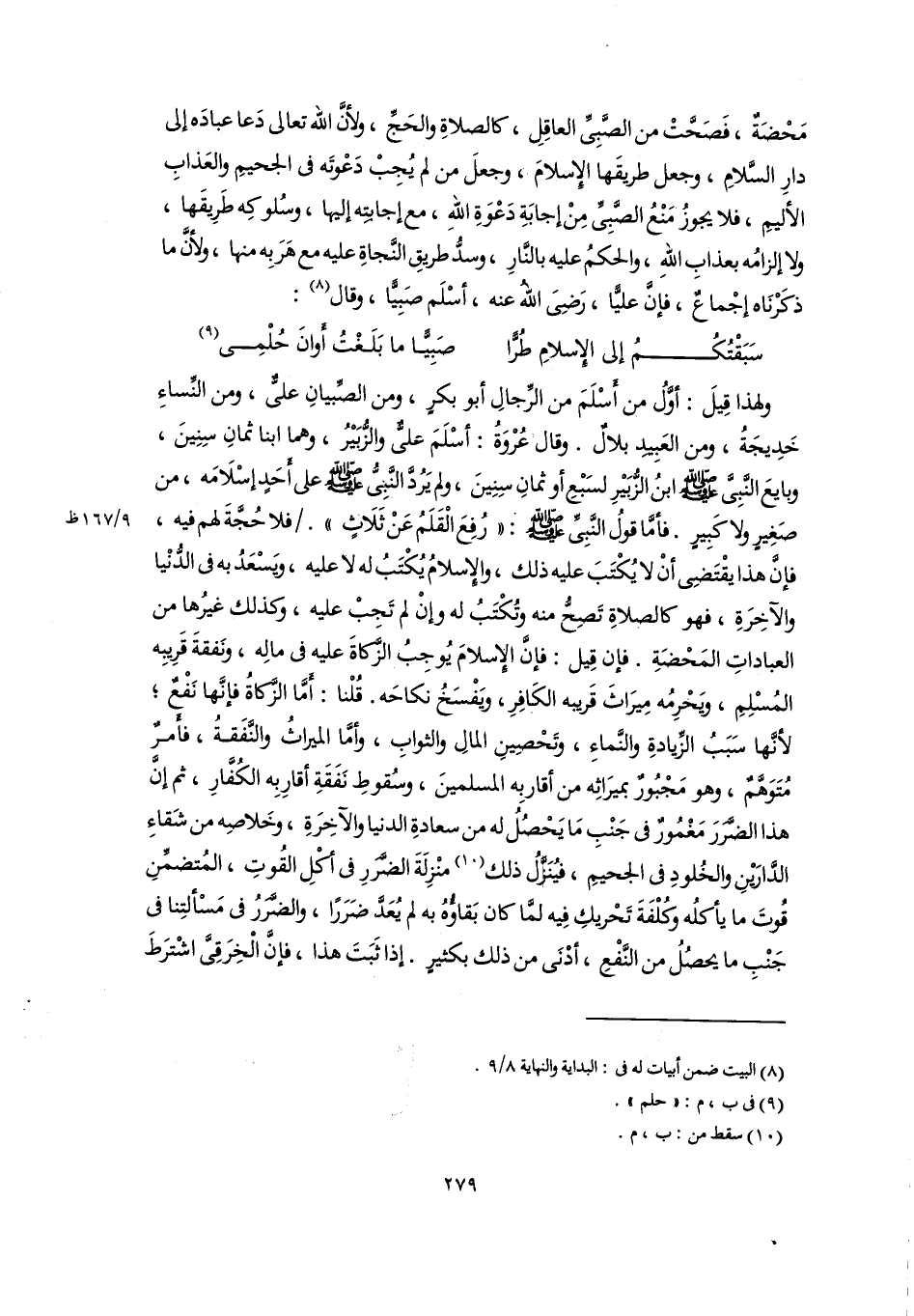 ولهذا قِيلَ: أوَّلُ من أَسْلَمَ من الرِّجالِ أبو بكرٍ، ومن الصِّبيانِ علىٌّ، ومن النِّساءِ خَدِيجَةُ، ومن العَبِيدِ بلالٌ. وقال عُرْوَةُ: أسْلَمَ علىٌّ والزُّبَيْرُ، وهما ابنا ثمانِ سِنِينَ، وبايعَ النَّبِىَّ -صلى اللَّه عليه وسلم- ابنُ الزُّبَيْرِ لسَبْعِ أو ثمانِ سِنِينَ، ولم يَرُدَّ النَّبِىُّ -صلى اللَّه عليه وسلم- على أحَدٍ إسْلَامَه، من صَغِيرٍ ولا كَبِيرٍ. فأمَّا قولُ النَّبِيِّ -صلى اللَّه عليه وسلم-: "رُفِعَ الْقَلَمُ عَنْ ثَلَاثٍ". فلا حُجَّةَ لهم فيه، فإنَّ هذا يقْتَضِى أنْ لا يُكْتَبَ عليه ذلك، والإِسلامُ يُكْتَبُ له لا عليه، ويَسْعَدُ به في الدُّنْيا والآخِرَةِ، فهو كالصلاةِ تَصِحُّ منه وتُكْتَبُ له وإنْ لم تَجِبْ عليه، وكذلك غيرُها من العباداتِ المَحْضَةِ. فإن قِيل: فإنَّ الإِسلامَ يُوجِبُ الزَّكاةَ عليه في مالِه، ونَفقةَ قَرِيبِه المُسْلِمِ، ويَحْرِمُه مِيرَاثَ قَريبه الكَافِرِ، ويَفْسَخُ نكاحَه. قُلْنا: أَمَّا الزَّكاةُ فإنَّها نَفْعٌ؛ لأنَّها سَبَبُ الزِّيادةِ والنَّماءِ، وتَحْصِينِ المالِ والثوابِ، وأمَّا الميراثُ والنَّفَقةُ، فأَمرٌ مُتَوَهَّمٌ، وهو مَجْبُورٌ بميرَاثِه من أقاربِه المسلمينَ، وسُقوطِ نَفَقَةِ أقارِبِه الكُفَّارِ، ثم إنَّ هذا الضَّرَرَ مَغْمُورٌ في جَنْبِ مَا يَحْصُلُ له من سعادةِ الدنيا والآخِرَةِ، وخَلاصِه من شَقاءِ الدَّارَيْنِ والخُلودِ في الجحيمِ، فيُنَزَّلُ ذلك (١٠) منْزِلَةَ الضَّرَرِ في أكْلِ القُوتِ، المُتضمِّنِ قُوتَ ما يأكلُه وكُلْفَةَ تَحْريكِ فِيه لمَّا كان بَقاؤُهُ به لم يُعَدَّ ضَرَرًا، والضَّرَرُ في مَسْألتِنا في جَنْبِ ما يحصُلُ من النَّفْعِ، أدْنَى من ذلك بكثيرٍ. إذا ثَبَتَ هذا، فإنَّ الْخِرَقِىَّ اشْترَطَ