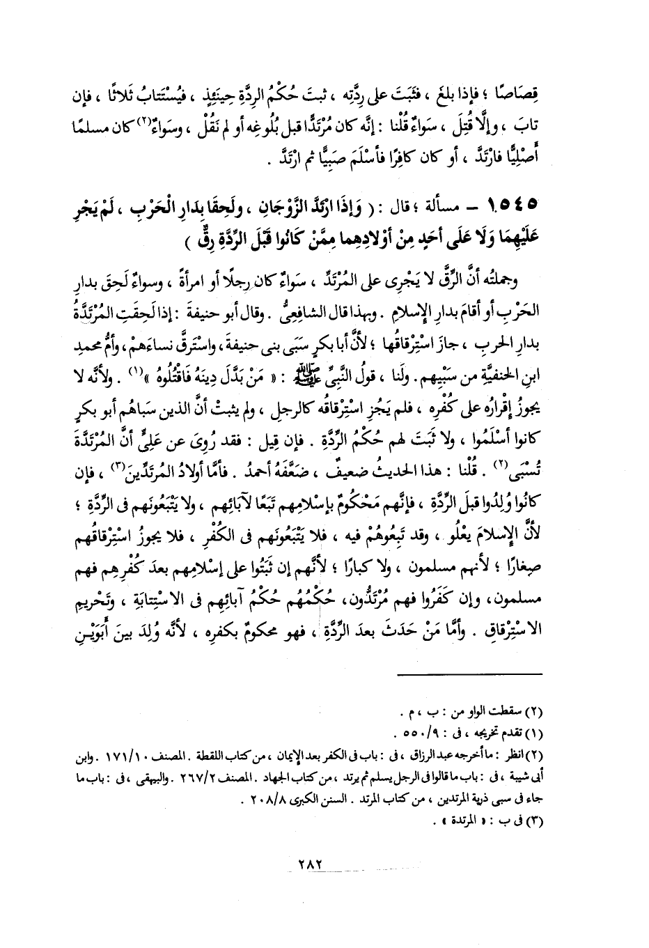 (٢) انظر: ما أخرجه عبد الرزاق، في: باب في الكفر بعد الإِيمان، من كتاب اللقطة. المصنف ١٠/ ١٧١. وابن أبى شيبة، في: باب ما قالوا في الرجل يسلم ثم يرتد، من كتاب الجهاد. المصنف ٢/ ٢٦٧، والبيهقي، في: باب ما جاء في سبى ذرية المرتدين، من كتاب المرتد. السنن الكبرى ٨/ ٢٠٨.
