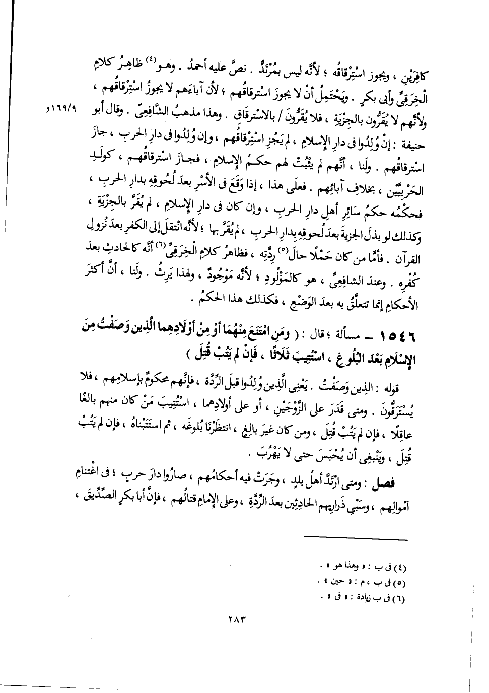 كافِرَيْنِ، ويجوز اسْتِرْقاقُه؛ لأنَّه ليس بمُرْتَدٍّ. نصَّ عليه أحمدُ. وهو (٤) ظاهِرُ كلامِ الْخِرَقِىِّ وأبى بكرٍ. ويَحتَمِلُ أنْ لا يجوزَ اسْترقاقُهم؛ لأن آباءَهم لا يجوزُ اسْتِرْقاقُهم، ولأنَّهم لا يُقَرُّون بالجِزْيةِ، فلا يُقَرُّونَ بالاسْترقَاقِ. وهذا مذهبُ الشَّافِعِىّ. وقال أبو حنيفة: إنْ وُلِدُوا في دارِ الإِسلامِ، لم يَجُزِ اسْتِرْقاقُهم، وإن وُلِدُوا في دارِ الحربِ، جازَ اسْترقاقُهم. وَلنا، أنَّهم لم يثْبُتْ لهم حكمُ الإِسلامِ، فجازَ اسْترقاقُهم، كوَلدِ الحَرْبِيَّيْن، بخلافِ آبائِهم. فعلَى هذا، إذا وَقَعَ في الأسْرِ بعدَ لُحُوقِهِ بدارِ الحربِ، فحكْمُه حكمُ سَائِرِ أهلِ دارِ الحربِ، وإن كان في دارِ الإِسلامِ، لم يُقَرَّ بالجِزْيَةِ، وكذلك لو بذلَ الجزيةَ بعدَ لُحوقِهِ بِدارِ الحربِ، لم يُقَرَّ بها؛ لأنَّه انْتقلَ إلى الكفرِ بعدَ نُزولِ القرآن. فأمَّا من كان حَمْلًا حالَ (٥) رِدَّتِه، فظاهرُ كلامِ الْخِرَقِىِّ (٦) أنَّه كالحادثِ بعدَ كُفْرِه. وعندَ الشافِعِىِّ، هو كالمَوْلُودِ؛ لأنَّه مَوْجُودٌ، ولهذا يَرِثُ. ولَنا، أنَّ أكثرَ الأحكامِ إنما تتعلَّقُ به بعدَ الوَضْعِ، فكذلك هذا الحكمُ.