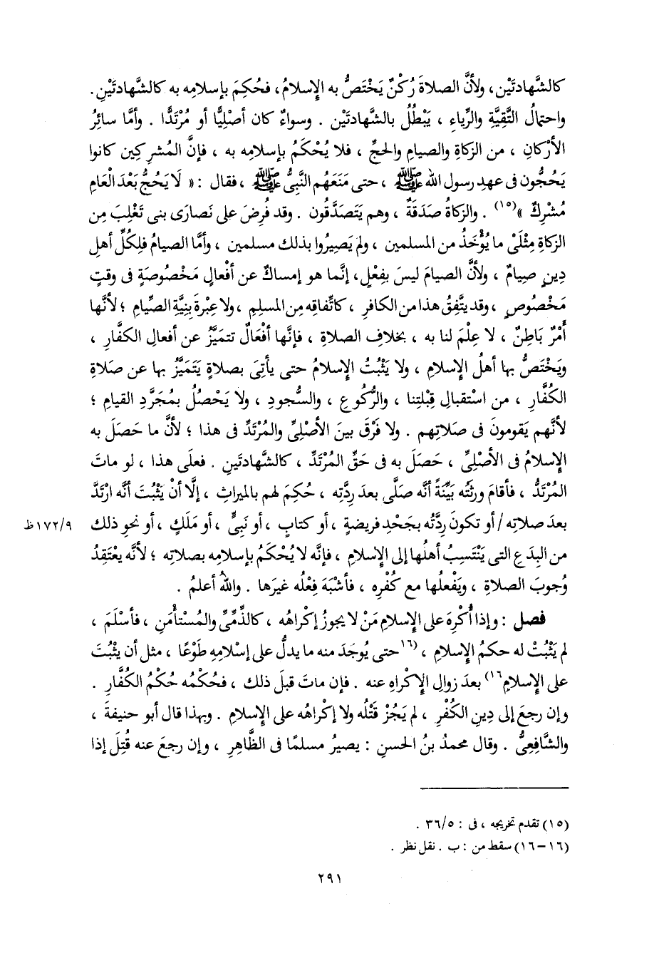 كالشَّهادتَيْن، ولأنَّ الصلاةَ رُكْنٌ يَخْتَصُّ به الإِسلامُ، فحُكِمَ بإسلامِه به كالشَّهادتَيْنِ. واحتمالُ التَّقِيَّةِ والرِّياءِ، يَبْطُلُ بالشَّهادتَيْن. وسواءٌ كان أصْلِيًّا أو مُرْتَدًّا. وأمَّا سائِرُ الأرْكانِ، من الزكاةِ والصيامِ والحجِّ، فلا يُحْكَمُ بإسلامِه به، فإنَّ المُشرِكِين كانوا يَحُجُّون في عهدِ رسول اللَّه -صلى اللَّه عليه وسلم-، حتى مَنَعَهُم النَّبِىُّ -صلى اللَّه عليه وسلم-، فقال: "لَا يَحُجُّ بَعْدَ الْعَامِ مُشْرِكٌ" (١٥). والزكاةُ صَدَقَةٌ، وهم يَتَصدَّقُون. وقد فُرِضَ على نَصارى بنى تَغْلِبَ مِن الزكاةِ مِثْلَىْ ما يُؤْخَذُ من المسلمين، ولم يَصِيرُوا بذلك مسلمين، وأمَّا الصيامُ فلِكُلِّ أهلِ دِينٍ صِيامٌ، ولأنَّ الصيامَ ليسَ بفِعْلٍ، إنَّما هو إمساكٌ عن أفْعالٍ مَخْصُوصَةٍ في وقتٍ مَخْصُوصٍ، وقد يتَّفِقُ هذا من الكافرِ، كاتِّفاقِه من المسلِمِ، ولا عِبْرةَ بِنِيَّةِ الصِّيامِ؛ لأنَّها أَمْرٌ بَاطِنٌ، لا عِلْمَ لنا به، بخلافِ الصلاةِ، فإنَّها أفْعَالٌ تتمَيَّزُ عن أفعالِ الكفَّارِ، ويَخْتَصُّ بها أهلُ الإِسلامِ، ولا يَثْبُتُ الإِسلامُ حتى يأتِىَ بصلاةٍ يَتَمَيَّزُ بها عن صَلاةِ الكُفَّارِ، من اسْتقبالِ قِبْلتِنا، والرُّكُوعِ، والسُّجودِ، ولا يَحْصُلُ بمُجَرَّدِ القيامِ؛ لأنَّهم يَقومونَ في صَلاتِهم. ولا فَرْقَ بينَ الأصْلِىِّ والمُرتَدِّ في هذا؛ لأنَّ ما حَصَل به الإِسلامُ في الأصْلِىِّ، حَصَلَ به في حَقِّ المُرْتَدِّ، كالشَّهادتَينِ. فعلَى هذا، لو ماتَ المُرْتَدُّ، فأقامَ ورثَتُه بَيِّنَةً أنَّه صَلَّى بعدَ رِدَّتِه، حُكَمَ لهم بالميراثِ، إلَّا أنْ يَثْبُتَ أنَّه ارْتَدَّ بعدَ صلاتِه أو تكونَ رِدَّتُه بجَحْدِ فريضةٍ، أو كتابٍ، أو نَبِىٍّ، أو مَلَكٍ، أو نحوِ ذلك من البِدَعِ التي يَنْتَسِبُ أهلُها إلى الإِسلامِ، فإنَّه لا يُحْكَمُ بإسلامِه بصلاتِه؛ لأنَّه يعْتَقِدُ وُجوبَ الصلاةِ، ويَفْعلُها مع كُفْرِه، فأشْبَهَ فِعْلُه غيرَها. واللهُ أعلمُ.