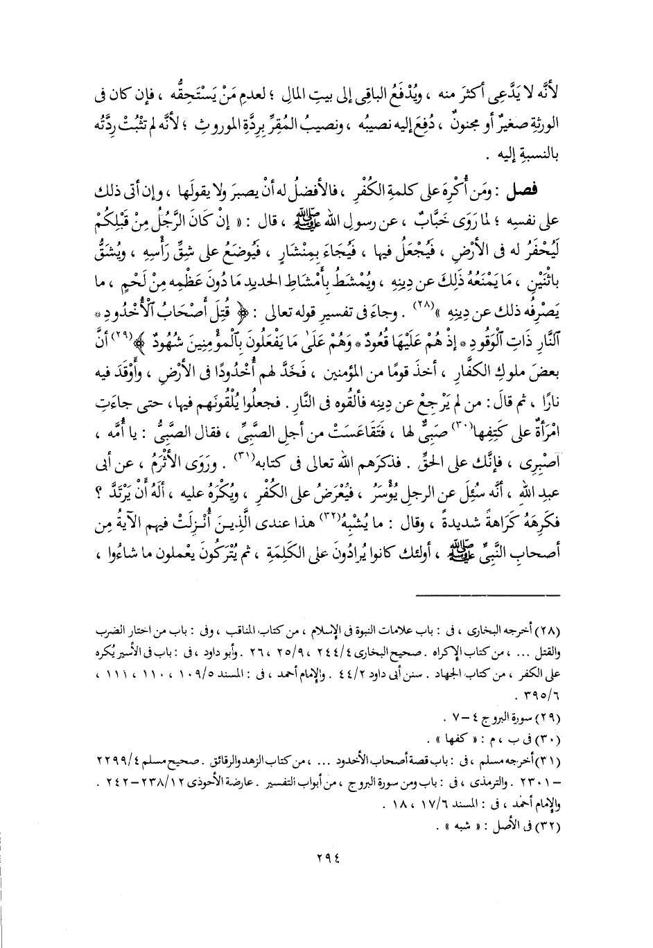 فصل: ومَن أُكْرِهَ على كلمةِ الكُفْرِ، فالأفضلُ له أنْ يصبرَ ولا يقولَها، وإن أتى ذلك علي نفسِه؛ لما رَوَى خَبَّابٌ، عن رسولِ اللَّه -صلى اللَّه عليه وسلم-، قال: "إنْ كَانَ الرَّجُلُ مِنْ قَبْلِكُمْ لَيُحْفَرُ له في الأرْضِ، فَيُجْعَلُ فيها، فَيُجَاءَ بِمِنْشَارٍ، فَيُوضَعُ على شِقِّ رَأْسِهِ، ويُشَقُّ باثْنَيْنِ، مَا يَمْنَعُهُ ذَلِكَ عن دِينِهِ، ويُمْشَطُ بِأَمْشَاطِ الحديِد مَا دُونَ عَظْمِه مِنْ لَحْمٍ، ما يَصْرِفُه ذلك عن دِينِهِ" (٢٨). وجاءَ في تفسيرِ قوله تعالى: {قُتِلَ أَصْحَابُ الْأُخْدُودِ (٤) النَّارِ ذَاتِ الْوَقُودِ (٥) إِذْ هُمْ عَلَيْهَا قُعُودٌ (٦) وَهُمْ عَلَى مَا يَفْعَلُونَ بِالْمُؤْمِنِينَ شُهُودٌ} (٢٩) أنَّ بعضَ ملوكِ الكفَّارِ، أخذَ قومًا من المؤمنين، فَخَدَّ لهم أُخْدُودًا في الأرْضِ، وأَوْقَدَ فيه نارًا، ثم قالَ: من لم يَرْجِعْ عن دِينِه فألقُوه في النَّارِ. فجعلُوا يُلْقُونَهم فيها، حتى جاءَتِ امْرَأةٌ على كَتِفِها (٣٠) صَبِىٌّ لها، فَتَقَاعَسَتْ من أجلِ الصَّبِىِّ، فقال الصَّبِىُّ: يا أُمَّه، اصْبِرِي، فإنَّك على الحقِّ. فذكرَهم اللَّه تعالى في كتابه (٣١). ورَوَى الأثْرَمُ، عن أبي عبدِ اللهِ، أنَّه سُئِلَ عن الرجلِ يُؤْسَرُ، فيُعْرَضُ على الكُفْرِ، ويُكْرَهُ عليه، ألَهُ أَنْ يَرْتَدَّ؟ فكَرِهَهُ كَرَاهةً شديدةً، وقال: ما يُشْبِهُ (٣٢) هذا عندى الَّذينَ أُنْزِلَتْ فيهم الآيةُ مِن أصحابِ النَّبِيِّ -صلى اللَّه عليه وسلم-، أولئك كانوا يُرادُونَ كلى الكَلِمَةِ، ثم يُتْرَكُونَ يعْملون ما شاءُوا,