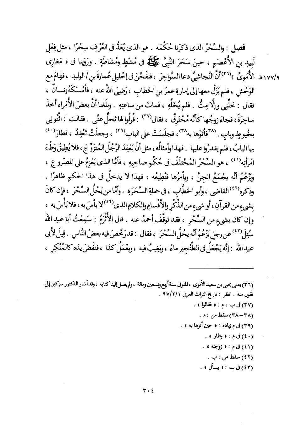 فصل: والسِّحْرُ الذي ذكرْنا حُكْمَه. هو الذي يُعَدُّ في العُرْفِ سِحْرًا، مثل فِعْلِ لَبِيدِ بنِ الأَعْصَمِ، حينَ سَحَرَ النَّبِىَّ -صلى اللَّه عليه وسلم- في مُشْطٍ ومُشَاطَةٍ. ورَوَينا في "مَغازِى الأُمَويِّ" (٣٦) أنَّ النَّجاشِىَّ دعا السَّواحِرَ، فنفَخْنَ في إحْليلِ عُمارةَ بنِ الوليدِ، فهامَ مع الوَحْشِ، فلم يَزَلْ معها إلى إمارةِ عمرَ بنِ الخطابِ، رَضِىَ اللهُ عنه، فأمْسَكَهُ إنسانٌ، فقال: خَلِّنِى وإلَّا مِتُّ. فلم يُخَلِّهِ، فماتَ من ساعتِهِ. وبلَغنا أنَّ بعضَ الأُمَراء أَخذَ ساحِرَةً، فجاءَ زوجُها كأنَّه مُحْتَرِقٌ، فقال (٣٧): قُولُوا لها تَحلُّ عنِّى. فقالت: ائْتُونِى بخُيوطٍ وبابٍ. [فأتَوْها به] (٣٨)، فجلَسَتْ على البابِ (٣٩)، وجعلَتْ تَعْقِدُ، فطارَ (٤٠) بها البابُ، فلم يقدرُوا عليها. فهذا وأمثالُه، مثل أنْ يَعْقِدَ الرَّجُلَ المُتزَوَّجَ، فلا يُطِيقُ وَطْءَ امْرأتِه (٤١)، هو السِّحْرُ المُخْتلَفُ في حُكْمِ صاحِبِهِ، فأمَّا الذي يَعْزِمُ على المصْروعِ، ويَزْعُمُ أنَّه يجْمَعُ الجِنَّ، ويأمرُها فتُطِيعُه، فهذا لا يدخلُ في هذا الحكمِ ظاهرًا. وذكره (٤٢) القاضي، وأبو الخطَّاب، في جملةِ السَّحَرَةِ. وأمَّا من يَحُلُّ السِّحْرَ، فإن كانَ بِشىءٍ من القرآنِ، أو شيءٍ من الذِّكْرِ والأقْسامِ والكلامِ الذي (٤٢) لا بأسَ به، فلا بَأْسَ به، وإن كان بشيءٍ من السِّحْرِ، فقد توقَّفَ أحمدُ عنه. قال الأَثْرَمُ: سَمِعْتُ أبا عبدِ اللَّه سُئِلَ (٤٣). عن رجلٍ يَزْعُمُ أنَّه يحُلُّ السِّحْرَ، فقال: قد رَخَّصَ فيه بعضُ النَّاسِ. قِيلَ لأبي عبدِ اللَّه: إنَّه يَجْعَلُ في الطِّنْجِير ماءً، ويَغِيبُ فيه، ويعْمَلُ كذا، فنفَضَ يدَه كالمُنْكِرِ،