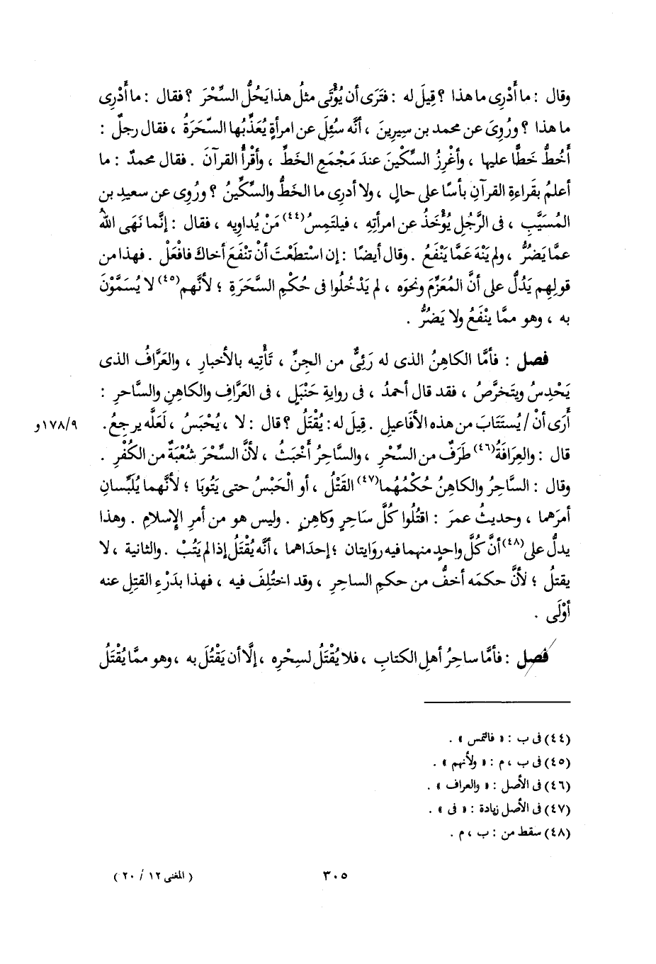 فصل: فأمَّا الكاهِنُ الذي له رَئِىٌّ من الجِنِّ، تَأْتِيه بالأخبارِ، والعَرَّافُ الذي يَحْدِسُ ويتَخرَّصُ، فقد قال أحمدُ، في روايةِ حَنْبَلٍ، في العَرَّافِ والكاهِنِ والسَّاحرِ: أَرَى أنْ يُستَتَابَ من هذه الأفَاعيلِ. قِيلَ له: يُقْتَلُ؟ قال: لا، يُحْبَسُ، لَعَلَّه يرجِعُ. قال: والعِرَافَةُ (٤٦) طَرَفٌ من السِّحْرِ، والسَّاحِرُ أَخْبَثُ، لأنَّ السِّحْرَ شُعْبَةٌ من الكُفْرِ. وقال: السَّاحِرُ والكاهِنُ حُكْمُهُما (٤٧) القَتْلُ، أو الْحَبْسُ حتى يَتُوبَا؛ لأنَّهما يُلَبِّسانِ أمرَهما، وحديثُ عمرَ: اقتُلُوا كُلَّ سَاحِرٍ وكاهِنٍ. وليس هو من أمرِ الإِسلامِ. وهذا يدلُّ على (٤٨) أنَّ كُلَّ واحدٍ منهما فيه روَايتان؛ إحدَاهما، أنَّه يُقْتَلُ إذا لم يَتُبْ. والثانية، لا يقتلُ؛ لأنَّ حكمَه أخفُّ من حكمِ الساحِرِ، وقد اختُلِفَ فيه، فهذا بدَرْءِ القتلِ عنه أوْلَى.