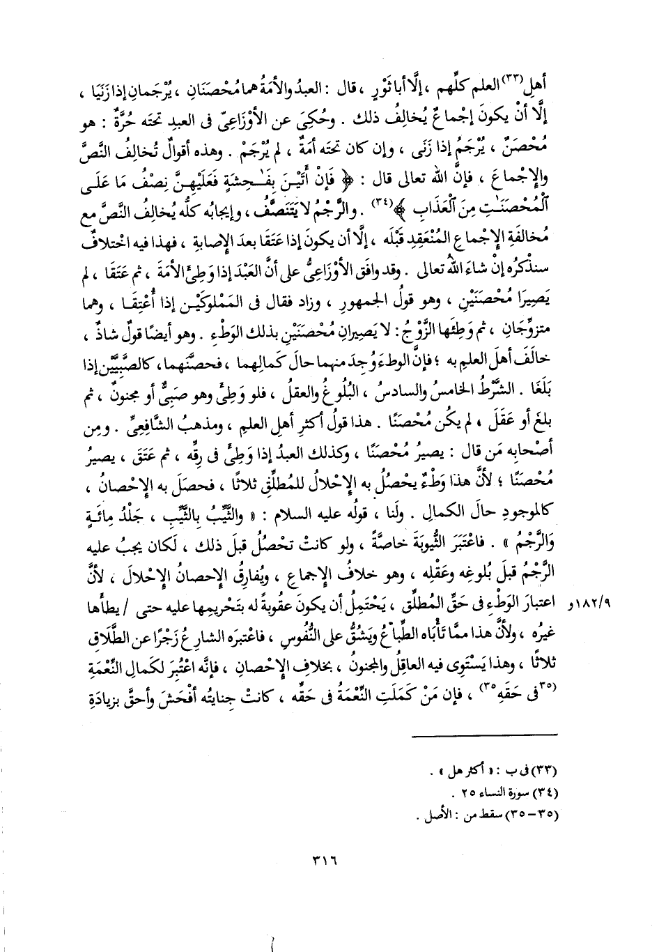 أهلِ (٣٣) العلم كلِّهم، إلَّا أبا ثَوْرٍ، قال: العبدُ والأمَةُ هما مُحْصَنَانِ، يُرْجَمانِ إذا زَنَيَا، إلَّا أن يكونَ إجْماعٌ يُخالِفُ ذلك. وحُكِىَ عن الأوْزَاعِىّ في العبدِ تحتَه حُرَّةٌ: هو مُحْصَنٌ، يُرْجَمُ إذا زَنَى، وإن كان تحتَه أمَةٌ، لم يُرْجَمْ. وهذه أقوالٌ تُخالِفُ النَّصَّ والإِجْماعَ، فإنَّ اللَّه تعالى قال: {فَإِنْ أَتَيْنَ بِفَاحِشَةٍ فَعَلَيْهِنَّ نِصْفُ مَا عَلَى الْمُحْصَنَاتِ مِنَ الْعَذَابِ} (٣٤). والرَّجْمُ لا يَتَنَصَّفُ، وإيجابُه كلُّه يُخالِفُ النَّصَّ بع مُخالفَةِ الإِجْماعِ المُنْعَقِدِ قَبْلَه، إلَّا أن يكونَ إذا عَتَقَا بعدَ الإِصابةِ، فهذا فيه اخْتلافٌ سنذْكرُه إنْ شاءَ اللهُ تعالى. وقد وافَق الأوْزَاعِىُّ على أنَّ العَبْدَ إذا وَطِىءَ الأمَةَ، ثم عَتَقَا، لم يَصِيرَا مُحْصَنَيْنِ، وهو قولُ الجمهورِ، وزاد فقال في المَمْلوكَيْن إذا أُعْتِقَا، وهما متزوِّجَانِ، ثم وَطِئَها الزَّوْجُ: لا يَصِيرانِ مُحْصَنَيْنِ بذلك الوَطْءِ. وهو أيضًا قولٌ شاذٌ، خالَفَ أهلَ العلمِ به؛ فإنَّ الوطءَ وُجِدَ منهما حالَ كَمالِهما، فحصَّنَهما، كالصَّبِيَّيْن إذا بَلَغَا. الشَّرْطُ الخامسُ والسادسُ، البُلُوغُ والعقلُ، فلو وَطِىءَ وهو صَبِىٌّ أو مجنونٌ، ثم بلغَ أو عَقَلَ، لم يكُن مُحْصَنًا. هذا قولُ أكثرِ أهلِ العلمِ، ومذهبُ الشَّافِعِىِّ. ومِن أصْحابِه مَن قال: يصيرُ مُحْصَنًا، وكذلك العبدُ إذا وَطِىءَ في رِقِّه، ثم عَتَقَ، يصيرُ مُحْصَنًا؛ لأنَّ هذا وَطْءٌ يحْصُلُ به الإِحْلالُ للمُطلِّق ثلاثًا، فحصَلَ به الإِحْصانُ، كالموجودِ حالَ الكمالِ. ولَنا، قولُه عليه السلام: "والثَّيِّبُ بِالثَّيِّبِ، جَلْدُ مِائَةٍ وَالرَّجْمُ". فاعْتَبَرَ الثُّيوبَةَ خاصَّةً، ولو كانتْ تحْصُلُ قبلَ ذلك، لَكان يجبُ عليه الرَّجْمُ قبلَ بُلوغِه وعَقْلِه، وهو خلافُ الإِجماعِ، ويُفارِقُ الإِحصانُ الإِحْلالَ، لأنَّ اعتبارَ الوَطْءِ في حَقِّ المُطلِّق , يَحْتَمِلُ أن يكونَ عقُوبةً له بتَحْريمِها عليه حتى يطأَها غيرُه، ولأنَّ هذا ممَّا تَأْبَاه الطِّباعُ ويَشُقُّ على النُّفُوسِ، فاعْتبرَه الشارِعُ زَجْرًا عن الطَّلَاقِ ثلاثًا، وهذا يَسْتَوِى فيه العاقِلُ والمجنونُ، بخلافِ الإِحْصانِ، فإنَّه اعْتُبِرَ لكَمالِ النِّعْمَةِ [في حَقِّهِ] (٣٥)، فإن مَنْ كَمَلَتِ النِّعْمَةُ في حَقِّه، كانتْ جِنايتُه أفْحَشَ وأحقَّ بزيادَةِ