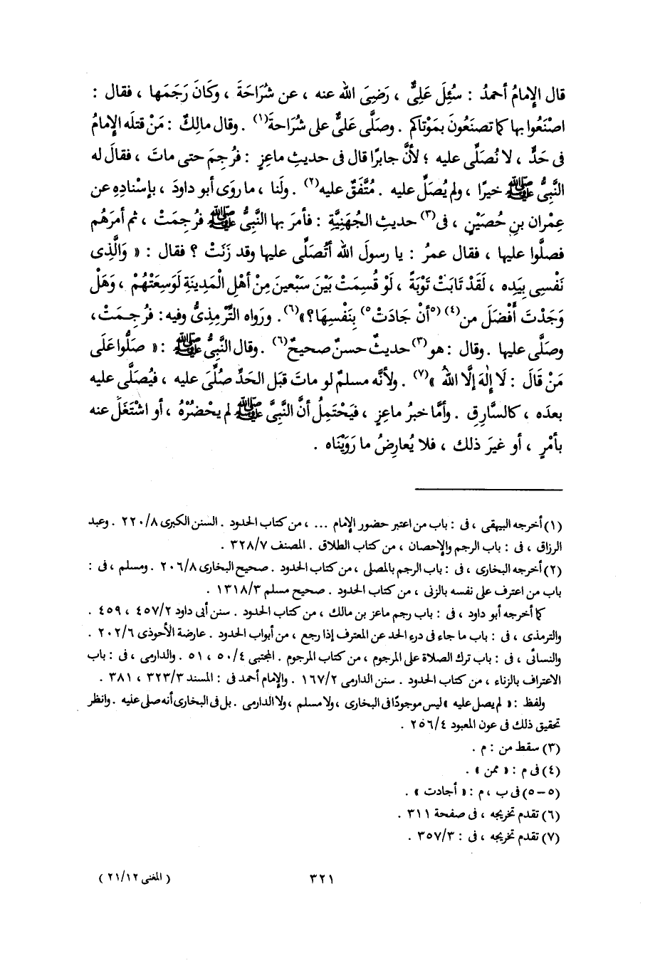 قال الإِمامُ أحمدُ: سُئِلَ عَلِىٌّ، رَضِىَ اللَّه عنه، عن شُرَاحَةَ، وكَانَ رَجَمَها، فقال: اصْنَعُوا بها كما تصنَعُونَ بمَوْتاكم. وصَلَّى عَلىٌّ على شُرَاحةَ (١). وقال مالِكٌ: مَنْ قتلَه الإِمامُ في حَدٍّ، لا نُصَلِّى عليه؛ لأنَّ جابرًا قال في حديثِ ماعِزٍ: فرُجِمَ حتى ماتَ، فقالَ له النَّبِىُّ -صلى اللَّه عليه وسلم- خيرًا، ولم يُصَلِّ عليه. مُتَّفَقٌ عليه (٢). ولَنا، ما روَى أبو داودَ، بإسْنادِهِ عن عِمْران بنِ حُصَيْنٍ، في (٣) حديثِ الجُهَنِيَّةِ: فأمرَ بها النَّبِىُّ -صلى اللَّه عليه وسلم- فرُجِمَتْ، ثم أمرَهُم فصلَّوا عليها، فقال عمرُ: يا رسولَ اللَّه أتُصَلِّى عليها وقد زَنَتْ؟ فقال: "وَالَّذِى نَفْسِى بِيَدِه، لَقَدْ تَابَتْ تَوْبَةً، لَوْ قُسِمَتْ بَيْنَ سَبْعينَ مِنْ أهْلِ الْمَدِينَةِ لَوَسِعَتْهُمْ، وَهَلْ وَجَدْتَ أَفْضَلَ من (٤) [أنْ جَادَتْ] (٥) بِنَفْسِهَا؟ " (٦). ورَواه التِّرْمِذِىُّ وفيه: فرُجِمَتْ، وصَلَّى عليها. وقال: هو (٣) حديثٌ حسنٌ صحيحٌ (٦). وقال النَّبِىُّ -صلى اللَّه عليه وسلم-: "صَلُّوا عَلَى مَنْ قَالَ: لَا إلهَ إلَّا اللهُ" (٧). ولأنَّه مسلمٌ لو ماتَ قبلَ الحَدِّ صُلِّىَ عليه، فيُصَلَّى عليه بعدَه، كالسَّارِقِ. وأمَّا خبرُ ماعِزٍ، فيَحْتَمِلُ أنَّ النَّبِىَّ -صلى اللَّه عليه وسلم- لم يحْضُرْهُ، أو اشْتَغَلَ عنه بأمْرٍ، أو غيرَ ذلك، فلا يُعارِضُ ما رَوَيْنَاه.