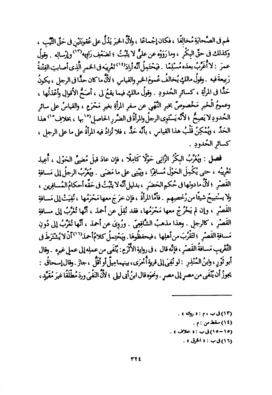 فصل: ويُغَرَّبُ البِكْرُ الزَّانِي حَوْلًا كَامِلًا، فإن عادَ قبلَ مُضِىِّ الحَوْلِ، أُعِيدَ تَغْرِيبُه، حتى يُكْمِلَ الحَوْلَ مُسافِرًا، ويَبْنِى على ما مَضَى. ويُغَرَّبُ الرجلُ إلى مَسافةِ القَصْرِ؛ لأنَّ ما دونَها في حُكمِ الحَضَرِ، بدليل أنَّه لا يثْبُتُ في حَقِّه أحكامُ المُسافِرين، ولا يسْتبيحُ شيئًا من رُخَصِهِم. فأمَّا المرأةُ، فإن خرَجَ معها مَحْرَمُها، نُفِيَتْ إلى مَسافةِ القَصْرِ، وإن لم يَخْرُجْ معها مَحْرَمُها، فقد نُقِلَ عن أحمدَ، أنَّها تُغَرَّبُ إلى مسافةِ القَصْرِ، كالرجلِ. وهذا مذهبُ الشَّافِعِىّ. ورُوِىَ عن أحمدَ، أنَّها تُغَرَّبُ إلى دُونِ مَسافةِ القَصْرِ؛ لتَقْرُبَ من أهلِها، فيحفظُوهَا. ويَحْتَملُ كلامُ أحمدَ (١٦) أنْ لا يُشْتَرَطَ في التَّغْريبِ مَسافةُ القَصْرِ، فإنَّه قال، في روايةِ الأَثْرَمِ: يُنْفَى من عملِه إلى عملٍ غيرِه. وقال أبو ثَوْرٍ، وابنُ المُنْذِرِ: لو نُفِىَ إلى قريةٍ أُخْرَى، بينهما مِيلٌ أو أقَلُّ، جازَ. وقال إسحاقُ: يجوزُ أن يُنْفَى من مصرٍ إلى مصرٍ. ونحوَه قال ابنُ أبي ليلى؛ لأنَّ النَفْىَ وردَ مُطْلَقًا غيرَ مُقَيَّدٍ،