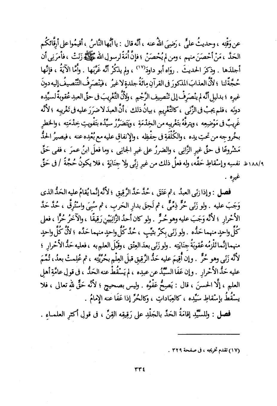 عن وَقْتِه، وحديثُ علىٍّ، رَضِىَ اللهُ عنه، أنَّه قال: يا أيُّها النَّاسُ، أقيمُوا على أرِقَّائكُم الحَدَّ، مَنْ أحْصَنَ منهم، ومن لم يُحْصَنْ؛ فإنَّ أَمَةً لرسولِ اللَّه -صلى اللَّه عليه وسلم- زَنَتْ، فأمرَنِى أن أجلدَها. وذكرَ الحديثَ. روَاه أبو داودَ (١٧)، ولم يذكُرْ أنَّه غَرَّبَها. وأَمَّا الآيَةُ، فإنَّها حُجَّةٌ لنا؛ لأنَّ العذابَ المذكورَ في القرآنِ مِائَةُ جلدةٍ لا غيرُ، فيَنْصَرِفُ التَّنْصيفُ إليه دونَ غيرِه؛ بدليلِ أنَّه لم ينْصَرِفْ إلى تَنْصِيفِ الرَّجْمِ، ولأنَّ التَّغْرِيبَ في حقِّ العبدِ عُقوبةٌ لسيِّدِه دونَه، فلم يجبْ في الزِّنَى، كالتَّغْرِيمِ، بيانُ ذلك، أنَّ العبدَ لا ضرَرَ عليه في تَغْريبِه؛ لأنَّه غَرِيبٌ في مَوْضِعِه، ويترفَّهُ بتَغْريبِه من الخِدْمَةِ، ويَتَضَرَّرُ سيِّدُه بتَفْويتِ خِدْمَتِه، والخطرِ بخُروجِه من تحتِ يدِه، والكُلْفَةِ في حِفْظِه، والإِنفاقِ عليه مع بُعْدِه عنه، فيصيرُ الحدُّ مَشْروعًا في حقِّ غيرِ الزَّانِي، والضررُ على غيرِ الجانِي، وما فعلَ ابنُ عمرَ، ففى حَقِّ نفسِه وإسْقاطِ حَقِّه، وله فعلُ ذلك من غيرِ زِنًى ولا جِنَايَةٍ، فلا يكونُ حُجَّةً في حَقِّ غيرِه.
