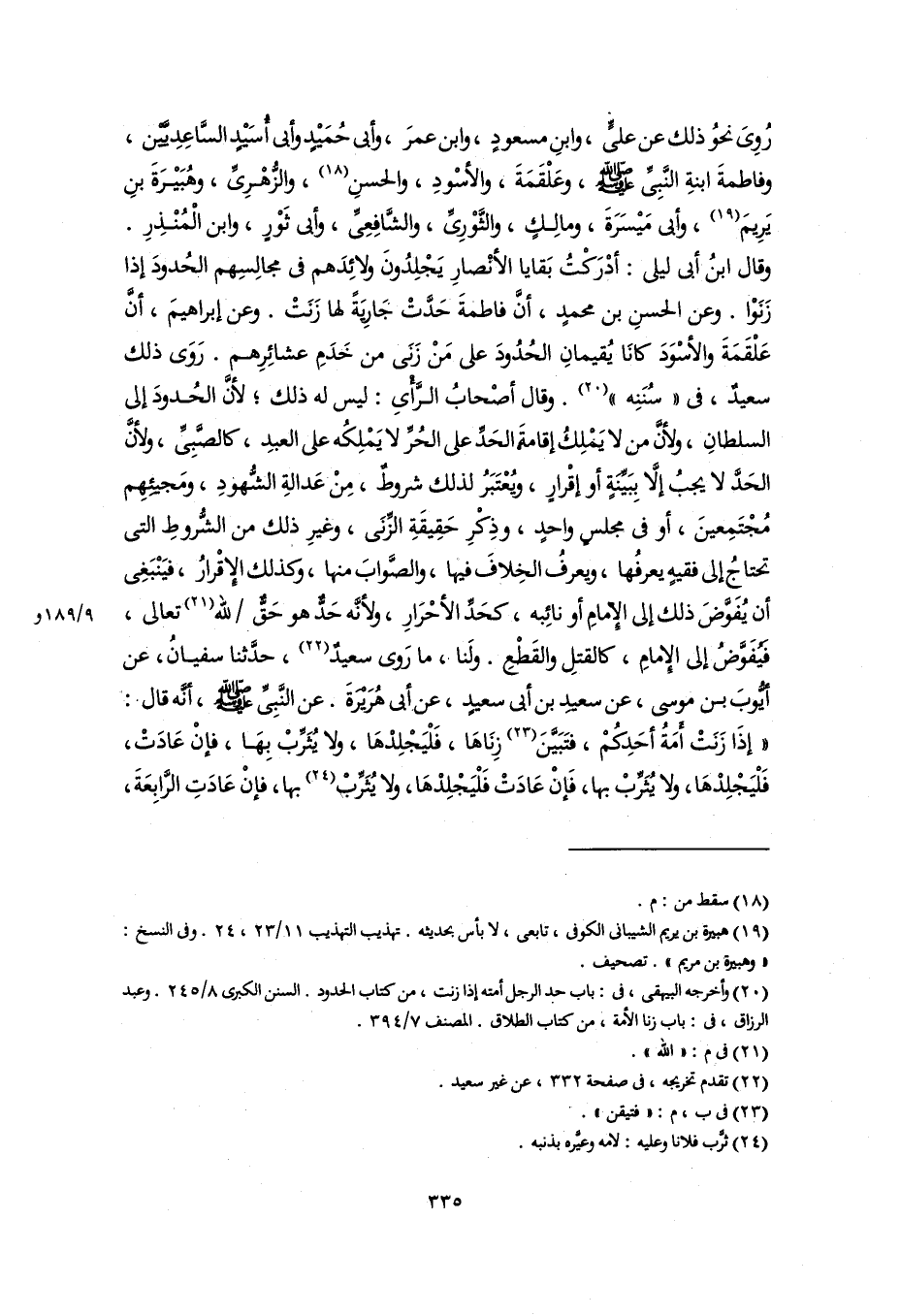رُوِىَ نحوُ ذلك عن علىٍّ، وابنِ مسعودٍ، وابن عمرَ، وأبى حُمَيْدٍ وأبى أُسَيْدٍ السَّاعِدِيَّيْن، وفاطمةَ ابنةِ النَّبِيِّ -صلى اللَّه عليه وسلم-، وعَلْقَمَةَ، والأسْودِ، والحسنِ (١٨)، والزُّهْرِيِّ، وهُبَيْرَةَ بنِ يَرِيمَ (١٩)، وأبى مَيْسَرَةَ، ومالِكٍ، والثَّوْرِيِّ، والشَّافِعِيِّ، وأبى ثَوْرٍ، وابن الْمُنْذِرِ. وقال ابنُ أبي ليلى: أدْرَكْتُ بَقايا الأنْصارِ يَجْلِدُونَ ولائِدَهم في مجالِسِهم الحُدودَ إذا زَنَوْا. وعن الحسنِ بن محمدٍ، أنَّ فاطمةَ حَدَّتْ جَارَيَةً لها زَنَتْ. وعن إبراهيمَ، أنَّ عَلْقَمَةَ والأسْوَدَ كانَا يُقيمانِ الحُدُودَ على مَنْ زَنَى من خَدَمِ عشائِرِهم. رَوَى ذلك سعيدٌ، في "سُنَنِه" (٢٠). وقال أصْحابُ الرّأْيِ: ليس له ذلك؛ لأنّ الحُدودَ إلى السلطانِ، ولأنَّ من لا يَمْلِكُ إقامةَ الحَدِّ على الحُرِّ لا يَمْلِكُه على العبدِ، كالصبِىِّ، ولأنَّ الحَدَّ لا يجبُ إلَّا بِبَيِّنَةٍ أو إقْرارٍ، ويُعْتَبَرُ لذلك شروطٌ، مِنْ عَدالةِ الشُّهودِ، ومَجيئِهِم مُجْتَمِعينَ، أو في مجلسٍ واحدٍ، وذِكْرِ حَقِيقَةِ الزِّنَى، وغيرِ ذلك من الشُّروطِ التي تحتاجُ إلى فقيهٍ يعرفُها، ويعرفُ الخِلافَ فيها، والصَّوابَ منها، وكذلك الإِقْرارُ، فيَنْبَغِى أن يُفَوَّضَ ذلك إلى الإِمامِ أو نائِبه، كحَدِّ الأحْرَارِ، ولأنَّه حَدٌّ هو حَقٌّ للَّه (٢١) تعالى، فَيُفَوَّضُ إلى الإِمامِ، كالقتلِ والقَطْعِ. ولَنا، ما رَوى سعيدٌ (٢٢)، حدَّثنا سفيانُ، عن أيُّوبَ بن موسى، عن سعيدِ بن أبي سعيدٍ، عن أبي هُرَيْرَةَ. عن النَّبِيِّ -صلى اللَّه عليه وسلم-، أنَّه قال: "إذَا زَنَتْ أَمَةُ أحَدِكُمْ، فتَبَيَّنَ (٢٣) زِنَاهَا، فَلْيَجْلِدْهَا، ولا يُثَرِّبْ بِهَا، فإنْ عَادَتْ، فَلْيَجْلِدْهَا، ولا يُثَرِّبْ بها، فَإنْ عَادَتْ فَلْيَجْلِدْهَا، ولا يُثَرِّبْ (٢٤) بها، فإنْ عَادَتِ الرَّابِعَةَ،