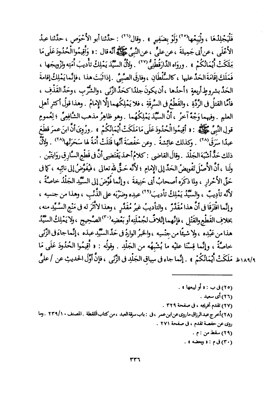 فَلْيَجْلِدْهَا، ولْيَبِعْها (٢٥) وَلَوْ بِضَفِيرٍ". وقال (٢٦): حدَّثنا أبو الأحْوَصِ، حدَّثنا عبدُ الأعْلَى، عن أبي جَمِيلةَ، عن علىٍّ، عن النَّبِيِّ -صلى اللَّه عليه وسلم- أنَّه قال: "وَأَقِيمُوا الْحُدُودَ عَلَى مَا مَلَكَتْ أَيْمَانُكُمْ". وروَاه الدَّارَقُطْنِيُّ (٢٧). ولأنَّ السَّيِّدَ يَمْلِكُ تأْديبَ أَمَتِه وتَزْويجَها، فَمَلَكَ إقَامَةَ الحَدِّ عليها، كالسُّلْطَانِ، وفارقَ الصَّبِيَّ. إذا ثَبَتَ هذا، فإنَّما يَمْلِكُ إقامةَ الحَدِّ بشروطٍ أربعةٍ؛ أحدُها، أن يكونَ جلدًا كحَدِّ الزِّنَى، والشُّرْبِ، وحَدِّ القَذْفِ، فأمَّا القتلُ في الرِّدَّةِ، والقَطْعُ في السَّرِقَةِ، فلا يَمْلِكُهما إلَّا الإِمامُ. وهذا قولُ أكثرِ أهلِ العلمِ. وفيهما وَجْهٌ آخرُ، أنَّ السَّيِّدَ يَمْلِكُهُما. وهو ظاهِرُ مذهب الشَّافِعِيِّ؛ لِعُمومِ قولِ النَّبِىِّ -صلى اللَّه عليه وسلم-: "أقِيمُوا الْحُدُودَ عَلَى مَا مَلَكَتْ أَيْمَانُكُمْ". ورُوِىَ أنَّ ابنَ عمرَ قطَعَ عبدًا سَرَقَ (٢٨). وكذلك عائِشةُ. وعن حَفْصَةَ أنَّها قَتَلَتْ أَمَةً لها سَحرَتْها (٢٨). ولأنَّ ذلك حَدٌّ أشْبَهَ الجَلْدَ. وقالَ القاضي: كلامُ أحمدَ يَقْتَضِي أنَّ في قَطْعِ السَّارِقِ روَايتَيْن. ولَنا، أنَّ الأَصْلَ تَفْويضُ الحَدِّ إلى الإِمامِ؛ لأنَّه حَقٌّ للهِ تعالى، فيُفَوَّضُ إلى نائِبِه، كما في حَقِّ الأحْرارِ، ولما ذكَرَه أصحابُ أبي حَنِيفةَ، وإنَّما فُوِّضَ إلى السَّيِّدِ الجَلْدُ خاصَّةً، لأنَّه تأدِيبٌ، والسَّيِّدُ يَمْلِكُ تأديبَ (٢٩) عبدِه وضَرْبَه على الذَّنْبِ، وهذا من جنسِه، وإنَّما افْتَرَقَا في أنَّ هذا مُقَدَّرٌ، والتأديبُ غيرُ مُقَدَّرٍ، وهذا لا أَثَرَ له في مَنْعِ السَّيِّدِ منه، بخلافِ القَطْعِ والقَتْلِ، فإنَّهما إتْلافٌ لجُمْلَتِه أو بَعْضِه (٣٠) الصَّحِيحِ، ولا يَمْلِكُ السَّيِّدُ هذا من عَبْدِه، ولا شيئًا من جِنْسِه، والخبرُ الواردُ في حَدِّ السَّيِّدِ عبدَه، إنَّما جاءَ في الزِّنَى خاصَّةً، وإنَّما قِسْنَا عليْه ما يُشْبِهُه من الجَلْدِ. وقولُه: "أَقِيمُوا الحُدُودَ عَلَى مَا مَلَكَتْ أَيْمَانُكُمْ". إنَّما جاء في سِياقِ الجَلْدِ في الزِّنَى، فإنَّ أوَّلَ الحديثِ عن عليٍّ