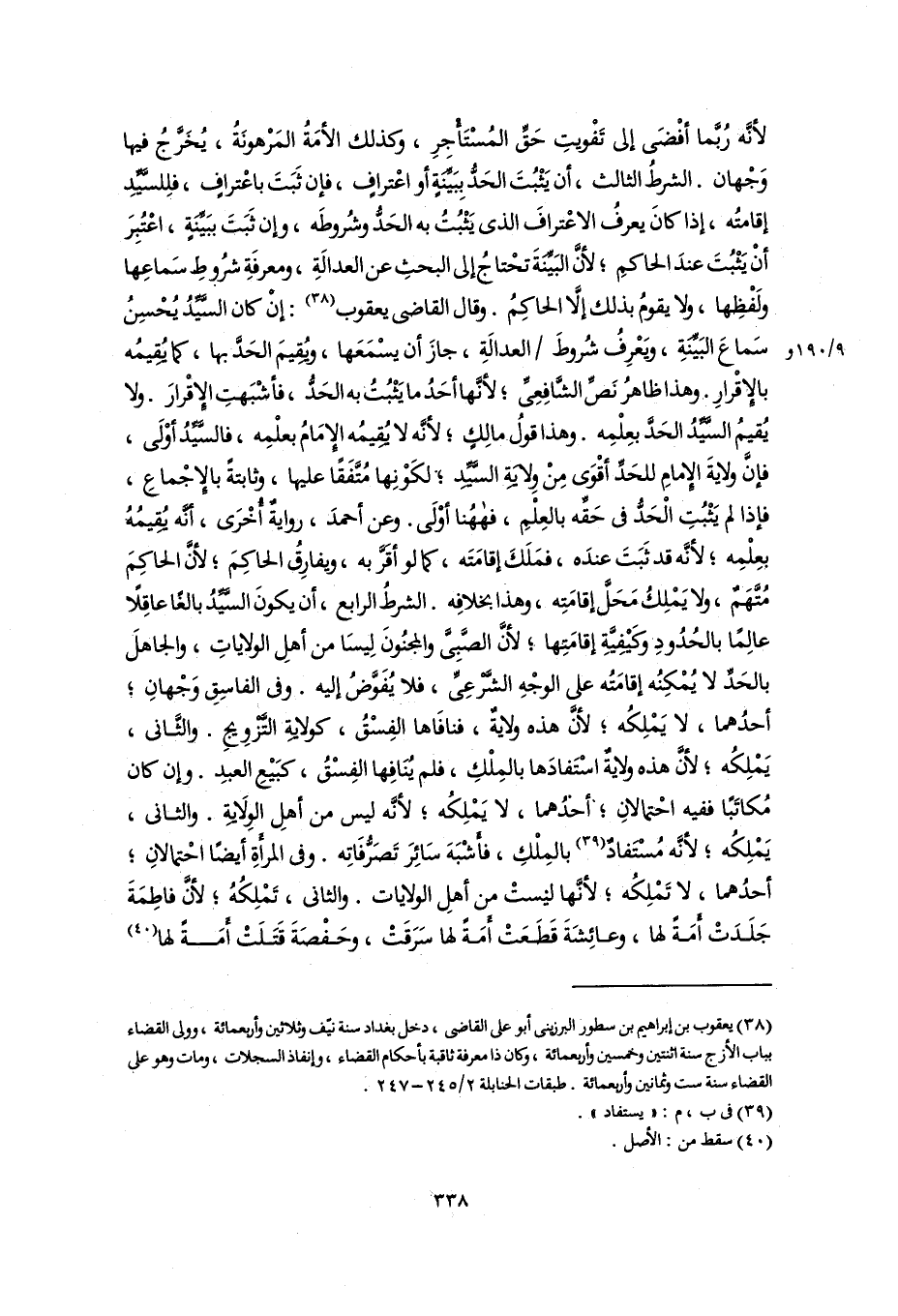 لأنَّه رُبَّما أفْضَى إلى تَفْويتِ حَقِّ المُسْتَأْجِرِ، وكذلك الأمَةُ المَرْهونَةُ، يُخَرَّجُ فيها وَجْهان. الشرطُ الثالث، أنَّ يَثْبُتَ الحَدُّ بِبَيِّنَةٍ أو اعْترافٍ، فإن ثَبَتَ باعْترافٍ، فلِلسَّيِّدِ إقامتُه، إذا كانَ يعرفُ الاعْترافَ الذي يَثْبُتُ به الحَدُّ وشُروطَه، وإن ثَبَتَ ببَيِّنةٍ، اعْتُبِرَ أنْ يَثْبُتَ عندَ الحاكمِ؛ لأنَّ البَيِّنَةَ تحْتاجُ إلى البحثِ عن العدالَةِ، ومعرفَةِ شرُوطِ سَماعِها ولَفْظِها، ولا يقومُ بذلك إلَّا الحاكِمُ. وقال القاضي يعقوب (٣٨): إنْ كان السَّيِّدُ يُحْسِنُ سَماعَ البَيِّنَةِ، ويَعْرِفُ شُروطَ العدالَةِ، جازَ أن يسْمَعَها، ويُقِيمَ الحَدَّ بها، كما يُقِيمُه بالإِقْرارِ. وهذا ظاهرُ نَصِّ الشَّافِعِيِّ؛ لأنَّها أحَدُ ما يَثْبُتُ به الحَدُّ، فأشْبَهتِ الإِقْرارَ. ولا يُقيمُ السَّيِّدُ الحَدِّ بعِلْمِه. وهذا قولُ مالِكٍ؛ لأنَّه لا يُقِيمُه الإِمَامُ بعلْمِه، فالسَّيِّدُ أوْلَى، فإنَّ ولايةَ الإِمامِ للحَدِّ أقْوَى مِنْ وِلايَةِ السَّيِّدِ؛ لكَوْنِها مُتَّفَقًا عليها، وثابتةً بالإِجْماعِ، فإذا لم يَثْبُتِ الْحَدُّ في حَقِّه بالعِلْمِ، فههُنا أوْلَى. وعن أحمدَ، روايةٌ أُخْرَى، أنَّه يُقِيمُهُ بعِلْمِه؛ لأنَّه قد ثَبَتَ عندَه، فمَلَكَ إقامَتَه، كما لو أقَرَّ به، ويفارِقُ الحاكِمَ؛ لأنَّ الحاكِمَ مُتَّهَمٌ، ولا يَمْلِكُ مَحَلَّ إقامَتِه، وهذا بخلافِه. الشرطُ الرابع، أن يكونَ السَّيِّدُ بالغًا عاقِلًا عالِمًا بالحُدُودِ وكَيْفِيَّةِ إقامَتِها؛ لأنَّ الصَّبِىَّ والمجنُونَ لِيسَا من أهلِ الولاياتِ، والجاهلَ بالحَدِّ لا يُمْكِنُه إقامَتُه على الوجْهِ الشَّرْعِيِّ، فلا يُفَوَّضُ إليه. وفي الفاسِقِ وَجْهانِ؛ أحدُهما، لا يَمْلِكُه؛ لأنَّ هذه ولايةٌ، فنافَاها الفِسْقُ، كولايةِ التَّزْوِيجِ. والثَّانى، يَمْلِكُه؛ لأنَّ هذه ولايةٌ اسْتَفادَها بالمِلْكِ، فلم يُنَافِها الفِسْقُ، كبَيْعِ العبدِ. وإن كان مُكاتَبًا ففيه احْتمالانِ؛ أحدُهما، لا يَمْلِكُه؛ لأنَّه ليس من أهلِ الوِلَايةِ. والثاني، يَمْلِكُه؛ لأنَّه مُسْتَفادٌ (٣٩) بالمِلْكِ، فأَشْبَهَ سَائِرَ تَصَرُّفَاتِه. وفي المرأَةِ أيضًا احْتمالانِ؛ أحدُهما، لا تَمْلِكُه؛ لأنَّها ليستْ من أهلِ الولايات. والثانى، تَمْلِكُهُ؛ لأنَّ فاطِمَةَ جَلَدَتْ أمَةً لها، وعائِشَةَ قَطَعَتْ أمَةً لها سَرَقَتْ، وحَفْصَةَ قَتَلَتْ أَمَةً لها (٤٠)