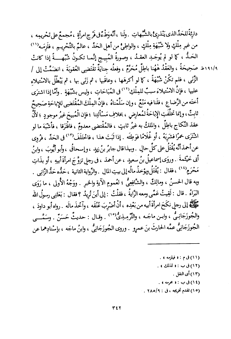 دارِئةً للحَدِّ الذي يَنْدَرِئُ بالشُّبُهاتِ. ولَنا، أنَّه وَطْءٌ في فَرْجِ امرأةٍ، مُجمعٌ على تَحْريمِه، من غيرِ مِلْكٍ ولا شُبْهَةِ مِلْكٍ، والواطِئُ من أهلِ الحَدِّ، عالمٌ بالتَّحْرِيمِ، فلَزِمَه (١١) الحَدُّ، كما لو لم يُوجَدِ العقدُ، وصورةُ المُبِيحِ إنَّما تكونُ شُبْهةً إذا كانتْ صَحِيحَةً، والعَقْدُ ههُنا باطِلٌ مُحَرَّمٌ، وفعلُه جِنايَةٌ تقْتَضِي العُقوبَةَ، انضَمَّتْ إلى الزِّنَى، فلم تكُنْ شُبْهَةً، كما لو أكرهَها، وعاقَبها، ثم زَنَى بها، ثم يَبْطُلُ بالاسْتيلاءِ عليها، فإنَّ الاسْتيلاءَ سببٌ للمِلْكِ (١٢) في المُبَاحَاتِ، وليس بشُبْهَةٍ. وأمَّا إذا اشترَى أختَه من الرَّضاعِ، فلَنا فيه مَنْعٌ، وإن سَلَّمْناهُ، فإنَّ المِلْكَ المُقْتَضِى للإِباحَةِ صَحِيحٌ ثابِتٌ، وإنما تخلَّفَتِ الإِباحَةُ لمُعارِضٍ، بخلافِ مَسْألتِنا؛ فإن الْمُبيحَ غيرُ موجودٍ؛ لأنَّ عقدَ النِّكاحِ باطِلٌ، والملكُ به غيرُ ثابتٍ، فالمُقْتضى معدومٌ، فافْتَرَقا، فأشْبَهَ ما لو اشْتَرَى خمرًا فشَرِبَهُ، أو غُلَامًا فوَطِئَه. إذا ثَبَتَ هذا، فاخْتَلَفَ (١٣) في الحَدِّ، فرُوِى عن أحمدَ أنَّه يُقْتَلُ على كلِّ حالٍ. وبهذا قال جابرُ بنُ زيدٍ، وإسحاقُ، وأبو أيُّوبَ، وابنُ أبي خَيْثَمةَ. وروَى إسماعيلُ بنُ سعيدٍ، عن أحمدَ، في رجلٍ تزوَّجَ امرأةَ أبيهِ، أو بذَاتِ مَحْرَمٍ (١٤)، فقال: يُقْتَلُ ويؤخذُ مالُه إلى بيتِ المالِ. والرِّواية الثانية، حَدُّه حَدُّ الزَّانِى. وبه قال الحسن، ومالِكٌ، والشَّافِعِيُّ؛ لعُمومِ الآيةِ والخبرِ. ووَجْهُ الأُولى، ما رَوَى البَرَاءُ. قال: لَقِيتُ عَمِّى ومعه الرَّايةُ، فقلْتُ: إلى أينَ تُرِيدُ؟ فقال: بَعَثَنِى رسولُ اللَّه -صلى اللَّه عليه وسلم- إلى رجلٍ نكَحَ امرأةَ أبيه من بَعْدِه، أنْ أضْرِبَ عُنُقَه، وآخُذَ مالَه. رواه أبو داودَ، والجُوزَجَانِىُّ، وابن ماجَه، والتِّرْمِذِيُّ (١٥). وقال: حديثٌ حَسَنٌ. وسَمَّى الجُوزَجَانِيُّ عمَّه الحارثَ بنَ عمرٍو. وروى الجُوزَجَانِيُّ، وابنُ ماجَه، بإسْنادِهما عن