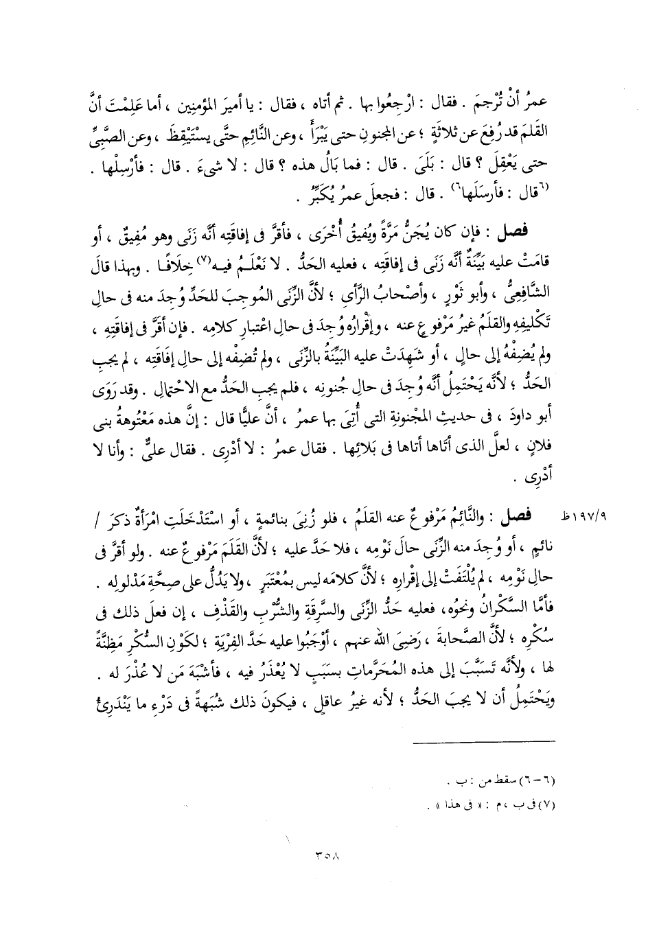 عمرُ أنْ تُرْجمَ. فقال: ارْجِعُوا بها. ثم أتاه، فقال: يا أميرَ المؤمنِين، أما عَلِمْتَ أنَّ القَلمَ قد رُفِعَ عن ثلاثَةٍ؛ عن المجنونِ حتى يَبْرَأَ، وعن النَّائِمِ حتى يسْتَيْقِظَ، وعن الصَّبِىِّ حتى يَعْقِلَ؟ قال: بَلَىَ. قال: فما بَالُ هذه؟ قال: لا شىءَ. قال: فأرْسِلْها. [قال: فأرسَلَها] (٦). قال: فجعلَ عمرُ يُكَبِّرُ.