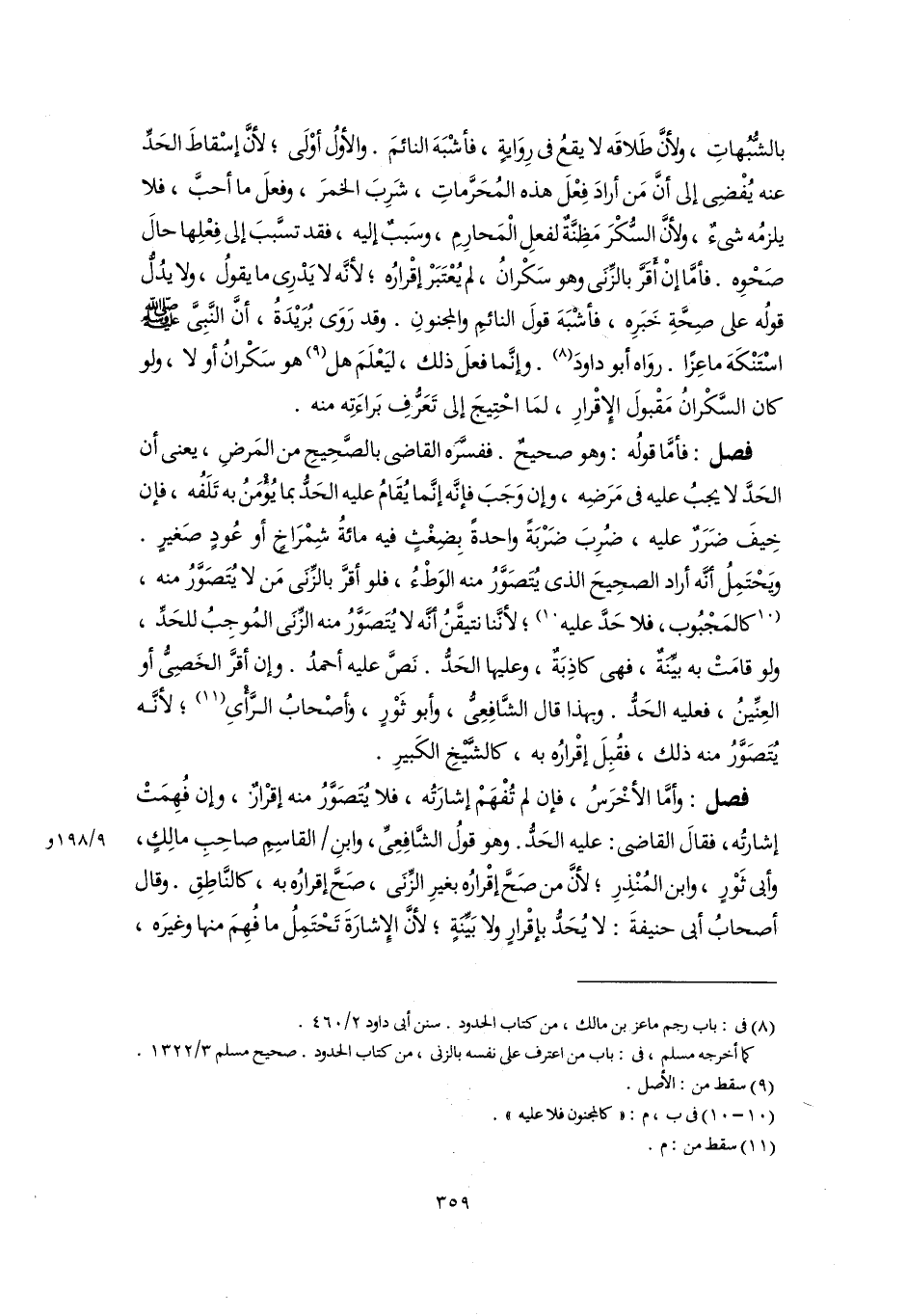 بالشُّبُهاتِ، ولأنَّ طَلاقَه لا يقعُ في رِوَايةٍ، فأشْبَهَ النائمَ. والأولُ أوْلَى؛ لأنَّ إسْقاطَ الحَدِّ عنه يُفْضِى إلى أنَّ مَن أرادَ فِعْلَ هذه المُحَرَّماتِ، شَرِبَ الخمرَ، وفعلَ ما أحبَّ، فلا يلزمُه شيءٌ، ولأنَّ السُّكْرَ مَظِنَّةٌ لفعلِ الْمَحارِمِ، وسَببٌ إليه، فقد تسَّببَ إلى فِعْلِها حالَ صَحْوِه. فأمَّا إنْ أَقَرَّ بالزِّنَى وهو سَكْرانُ، لم يُعْتَبَرْ إقْرارُه؛ لأنَّه لا يَدْرِى ما يقولُ، ولا يدُلُّ قولُه على صِحَّةِ خَبَرِه، فأشْبَهَ قولَ النائمِ والمجنونِ. وقد رَوَى بُرَيْدَةُ، أنَّ النَّبِىَّ -صلى اللَّه عليه وسلم- اسْتَنْكَهَ ماعِزًا. روَاه أبو داودَ (٨). وإنَّما فعلَ ذلك، ليَعْلَمَ هل (٩) هو سَكْرانُ أو لا، ولو كان السَّكْرانُ مَقْبولَ الإِقْرارِ، لمَا احْتِيجَ إلى تَعَرُّفِ بَراءَتِه منه.