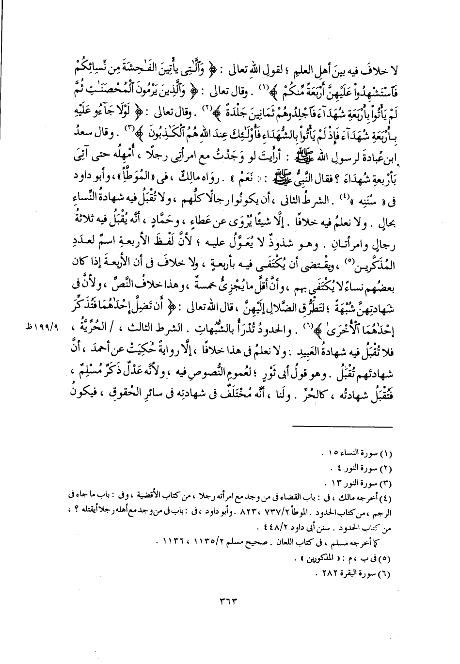 لا خلافَ فيه بينَ أهلِ العلمِ؛ لقولِ اللهِ تعالى: {وَاللَّاتِي يَأْتِينَ الْفَاحِشَةَ مِنْ نِسَائِكُمْ فَاسْتَشْهِدُوا عَلَيْهِنَّ أَرْبَعَةً مِنْكُمْ} (١). وقال تعالى: {وَالَّذِينَ يَرْمُونَ الْمُحْصَنَاتِ ثُمَّ لَمْ يَأْتُوا بِأَرْبَعَةِ شُهَدَاءَ فَاجْلِدُوهُمْ ثَمَانِينَ جَلْدَةً} (٢). وقال تعالى: {لَوْلَا جَاءُوا عَلَيْهِ بِأَرْبَعَةِ شُهَدَاءَ فَإِذْ لَمْ يَأْتُوا بِالشُّهَدَاءِ فَأُولَئِكَ عِنْدَ اللَّهِ هُمُ الْكَاذِبُونَ} (٣). وقال سعدُ بن عُبادةَ لرسولِ اللَّه -صلى اللَّه عليه وسلم-: أرأَيتَ لو وَجَدْتُ مع امرأتِى رجلًا، أُمْهِلُه حتى آتِىَ بَأرْبعةِ شُهدَاءَ؟ فقال النَّبِىُّ -صلى اللَّه عليه وسلم-: "نَعَمْ". روَاه مالِكٌ، في "المُوَطَّإِ"، وأبو داود في "سُنَنِه" (٤). الشرطُ الثاني، أن يكونُوا رجالًا كلُّهم، ولا تُقْبَلُ فيه شهادةُ النِّساءِ بحالٍ. ولا نعلمُ فيه خلافًا. إلَّا شيئًا يُرْوَى عن عَطاءٍ، وحَمَّادٍ، أنَّه يُقْبَلُ فيه ثلاثةُ رجالٍ وامرأتانِ. وهو شذوذٌ لا يُعَوَّلُ عليه؛ لأنَّ لَفْظَ الأربعةِ اسمٌ لعدَدِ المُذَكَّرين (٥)، ويقْتضى أن يُكْتَفَى فيه بأربعةٍ، ولا خلافَ في أن الأربعةَ إذا كان بعضُهم نساءً لا يُكْتَفَى بهم، وأنَّ أقلَّ ما يُجْزِئُ خمسةٌ، وهذا خلافُ النَّصِّ، ولأنَّ في شَهادتِهنَّ شُبْهَةً؛ لتَطَرُّقِ الضَّلالِ إلَيْهِنَّ، قال اللَّه تعالى: {أَنْ تَضِلَّ إِحْدَاهُمَا فَتُذَكِّرَ إِحْدَاهُمَا الْأُخْرَى} (٦). والحدودُ تُدْرَأُ بالشُّبُهاتِ. الشرط الثالث، الحُرِّيَّةُ، فلا تُقْبَلُ فيه شهادةُ العَبِيدِ، ولا نعلمُ في هذا خلافًا، إلَّا روايةً حُكِيَتْ عن أحمدَ، أنَّ شهادتَهم تُقْبَلُ. وهو قولُ أبى ثَوْرٍ؛ لعُمومِ النُّصوصِ فيه، ولأنَّه عَدْلٌ ذَكَرٌ مُسْلِمٌ، فَتُقْبَلُ شهادتُه، كالحُرِّ. ولَنا، أنَّه مُخْتَلَفٌ في شهادتِه في سائرِ الحُقوقِ، فيكونُ