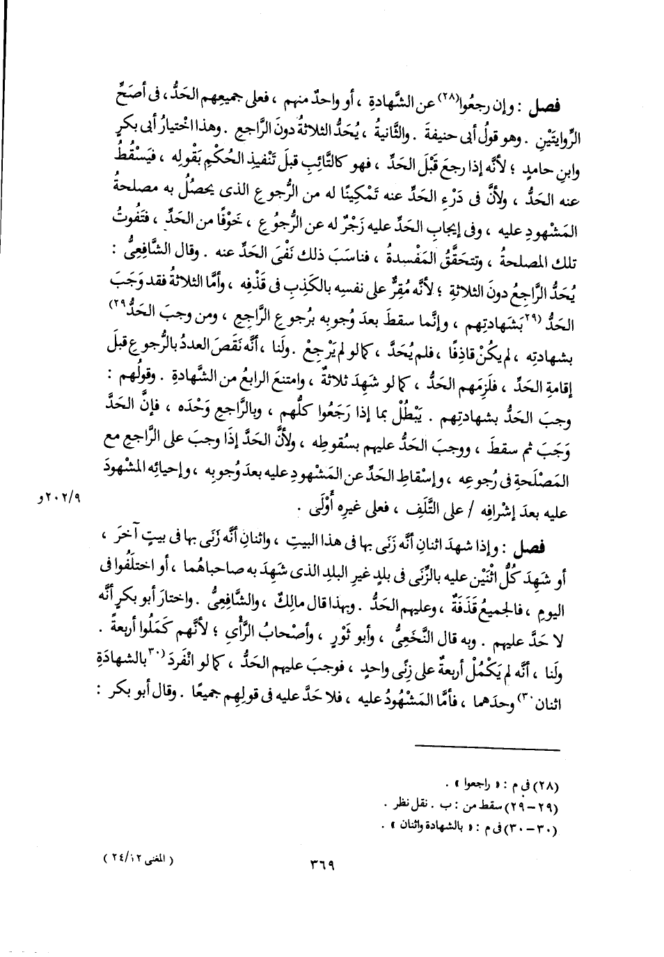 فصل: وإن رجعُوا (٢٨) عن الشَّهادةِ، أو واحدٌ منهم، فعلى جميعِهم الحَدُّ، في أصَحِّ الرِّوايتَيْنِ. وهو قولُ أبى حنيفةَ. والثَّانيةُ، يُحَدُّ الثلاثةُ دونَ الرَّاجعِ. وهذا اخْتيارُ أبى بكرٍ وابنِ حامدٍ؛ لأنَّه إذا رجعَ قَبْلَ الحَدِّ، فهو كالتَّائِبِ قبلَ تَنْفيذِ الحُكْمِ بَقْولِه، فيَسْقُطُ عنه الحَدُّ، ولأنَّ في دَرْءِ الحَدِّ عنه تَمْكِينًا له من الرُّجوعِ الذي يحصُلُ به مصلحةُ المَشْهودِ عليه، وفى إيجابِ الحَدِّ عليه زَجْرٌ له عن الرُّجُوعِ، خَوْفًا من الحَدِّ، فتَفُوتُ تلك المصلحةُ، وتتحَقَّقُ المَفْسدةُ، فناسَبَ ذلك نَفْىَ الحَدِّ عنه. وقال الشَّافِعِىُّ: يُحَدُّ الرَّاجِعُ دونَ الثلاثةِ؛ لأنَّه مُقِرٌّ على نفسِه بالكَذِبِ في قَذْفِه، وأمَّا الثلاثةُ فقد وَجَبَ الحَدُّ [بَشَهادتِهم، وإنَّما سقطَ بعدَ وُجوبِه برُجوعِ الرَّاجِعِ، ومن وجبَ الحَدُّ] (٢٩) بشهادتِه، لم يكُنْ قاذِفًا، فلم يُحَدَّ، كما لو لم يَرجِعْ. ولَنا، أنَّه نَقَصَ العددُ بالرُّجوعِ قبلَ إقامةِ الحَدِّ، فلَزِمَهم الحَدُّ، كما لو شَهِدَ ثلاثةٌ، وامتنعَ الرابعُ من الشَّهادةِ. وقولُهم: وجبَ الحَدُّ بشهادتِهم. يَبْطُلْ بما إذا رَجَعُوا كلُّهم، وبالرَّاجعِ وَحْدَه، فإنَّ الحَدَّ وَجَبَ ثم سقطَ، ووجبَ الحَدُّ عليهم بسُقوطِه، ولأنَّ الحَدَّ إذَا وجبَ على الرَّاجعِ مع المَصْلَحةِ في رُجوعِه، وإسْقاطِ الحَدِّ عن المَشْهودِ عليه بعدَ وُجوبِه، وإحيائِه المشْهودَ عليه بعدَ إشْرافِه على التَّلَفِ، فعلى غيرِه أَوْلَى.