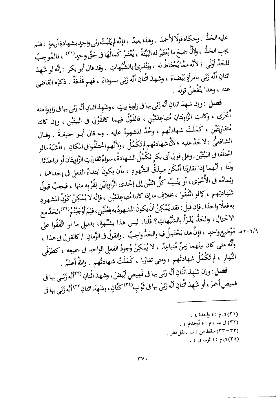 فصل: وإن شهِدَ اثنانِ أنَّه زَنَى بها في زاويةِ بيتٍ، وشَهِدَ اثنانِ أنَّه زَنَى بها في زاويةٍ منه أُخْرَى، وكانتِ الزَّاوِيَتانِ مُتباعِدَتَيْنِ، فالقَوْلُ فيهما كالقَوْلِ في البيتَيْن، وإن كانتا مُتقارِبَتَيْنِ، كَمَلَتْ شهادتُهم، وحُدَّ المشهودُ عليه. وبه قال أبو حنيفةَ. وقال الشافعيُّ: لا حَدَّ عليه؛ لأنَّ شهادتَهم لم تَكْمُلْ، ولأنَّهم اخْتلَفُوا في المكانِ، فأشْبَهْ ما لو اخْتلَفا في البَيْتَيْن. وعلى قولِ أبى بكرٍ تَكْمُلُ الشهادةُ، سواءٌ تَقاربَتِ الزَّاوِيتَان أو تباعدَتَا. ولَنا، أنَّهما إذا تقاربَتَا أمْكَن صِدْقُ الشُّهودِ، بأن يكونَ ابتداءُ الفعلِ في إحداهما، وتَمامُه في الأُخْرَى، أو ينْسِبُه كلُّ اثنَيْن إلى إحْدى الزَّاوِيتَيْنِ لِقُرْبِه منها، فيجبُ قَبولُ شَهادتِهم، كما لو اتَّفَقُوا، بخلافِ ما إذا كانتا مُتباعِدَتَيْن، فإنَّه لا يُمْكِنُ كَوْنُ المشهودِ به فعلًا واحدًا. فإن قيلَ: فقد يُمْكِنُ أنْ يكونَ المشهودُ به فِعْلَيْنِ، فلِمَ أوْجَبْتُمُ (٣٢) الحَدَّ مع الاحْتمالِ، والحَدُّ يُدْرَأُ بالشُّبُهاتِ؟ قُلْنا: ليس هذا بشُبْهةٍ، بدليلِ ما لو اتَّفَقُوا على مَوْضِعٍ واحدٍ، فإنَّ هذا يَحْتَمِلُ فيه والحَدُّ واجِبٌ. والقولُ في الزَّمانِ كالقولِ في هذا، وأنَّه متى كان بينَهما زمنٌ مُتباعِدٌ، لا يُمْكِنُ وُجودُ الفعلِ الواحدِ في جميعِه، كطرَفَىِ النَّهارِ، لم تَكْمُلْ شهادتُهم، ومتى تقارَبا، كَمَلَتْ شهادتُهم. واللهُ أعلمُ.