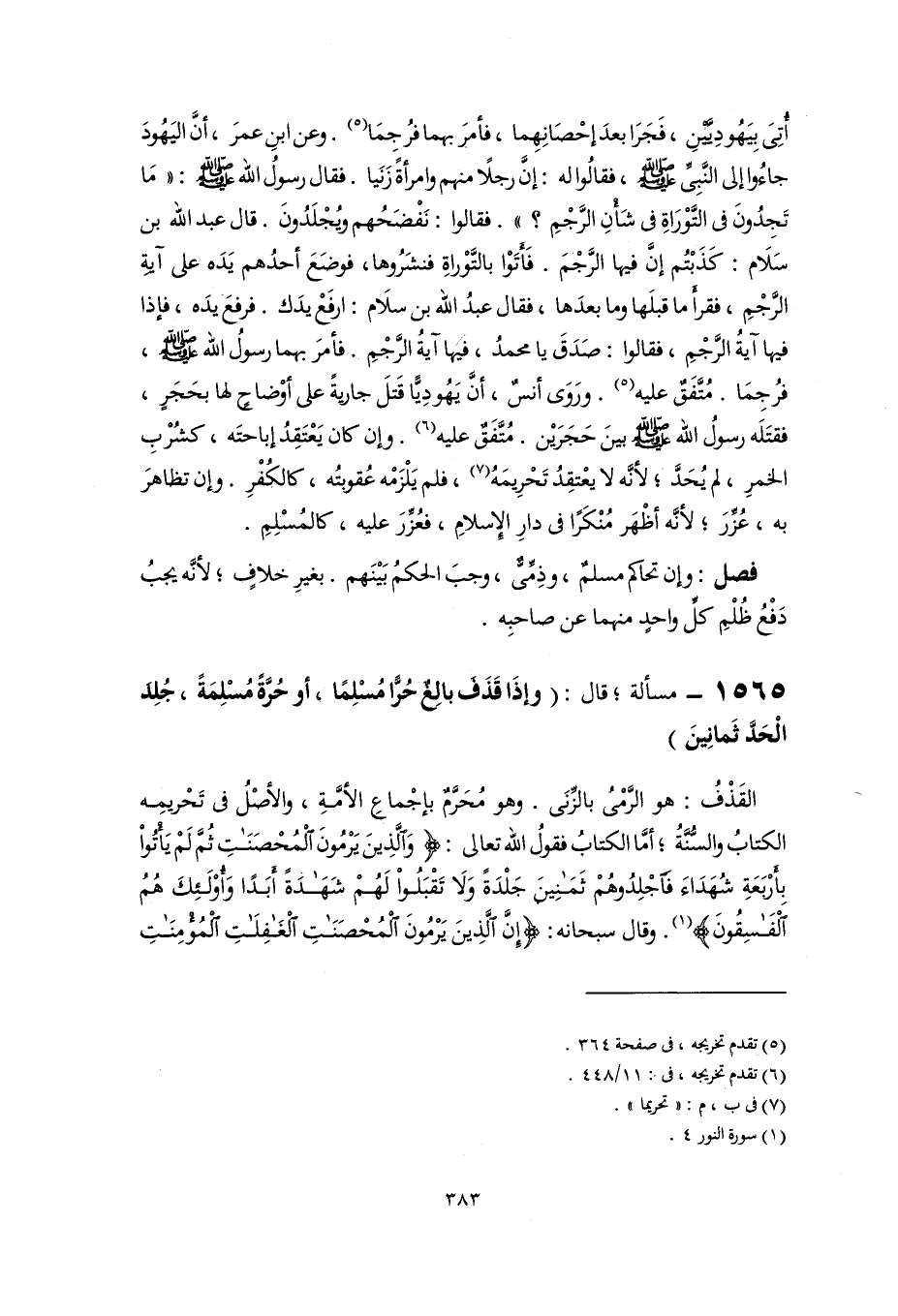 أُتِىَ بِيَهُودِيَّيْنِ، فَجَرَا بعدَ إحْصَانِهِما، فأمرَ بهما فرُجِمَا (٥). وعن ابنِ عمرَ، أنَّ اليَهُودَ جاءُوا إلى النَّبِيِّ -صلى اللَّه عليه وسلم-، فقالُوا له: إنَّ رجلًا منهم وامرأةً زَنَيا. فقال رسولُ اللَّه -صلى اللَّه عليه وسلم-: "مَا تَجِدُونَ في التَّوْرَاةِ في شَأْنِ الرَّجْمِ؟ ". فقالوا: نَفْضَحُهم ويُجْلَدُونَ. قال عبد اللَّه بن سَلَام: كَذَبْتُم إنَّ فيها الرَّجْمَ. فَأَتَوْا بالتَّوْراةِ فنشَرُوها، فوضَعَ أحدُهم يَدَه على آيةِ الرَّجْمِ، فقرأَ ما قبلَها وما بعدَها، فقال عبدُ اللَّه بن سلَام: ارفَعْ يدَك. فرفعَ يدَه، فإذا فيها آيةُ الرَّجْمِ، فقالوا: صَدَقَ يا محمدُ، فيها آيةُ الرَّجْمِ. فأمرَ بهما رسولُ اللَّه -صلى اللَّه عليه وسلم-, فرُجِمَا. مُتَّفَقٌ عليه (٥). ورَوَى أنسٌ، أنَّ يَهُودِيًّا قَتلَ جاريةً على أوْضاحٍ لها بحَجَرٍ، فقتَلَه رسولُ اللَّه -صلى اللَّه عليه وسلم- بينَ حَجَرَيْن. مُتَّفَقٌ عليه (٦). وإن كان يَعْتَقِدُ إباحتَه، كشُرْبِ الخمرِ، لم يُحَدَّ؛ لأنَّه لا يعْتقِدُ تَحْرِيمَهُ (٧)، فلم يَلْزَمْه عُقوبتُه، كالكُفْرِ. وإن تظاهرَ به، عُزِّرَ؛ لأنَّه أظْهَر مُنْكَرًا في دارِ الإِسلامِ، فعُزِّرَ عليه، كالمُسْلِمِ.