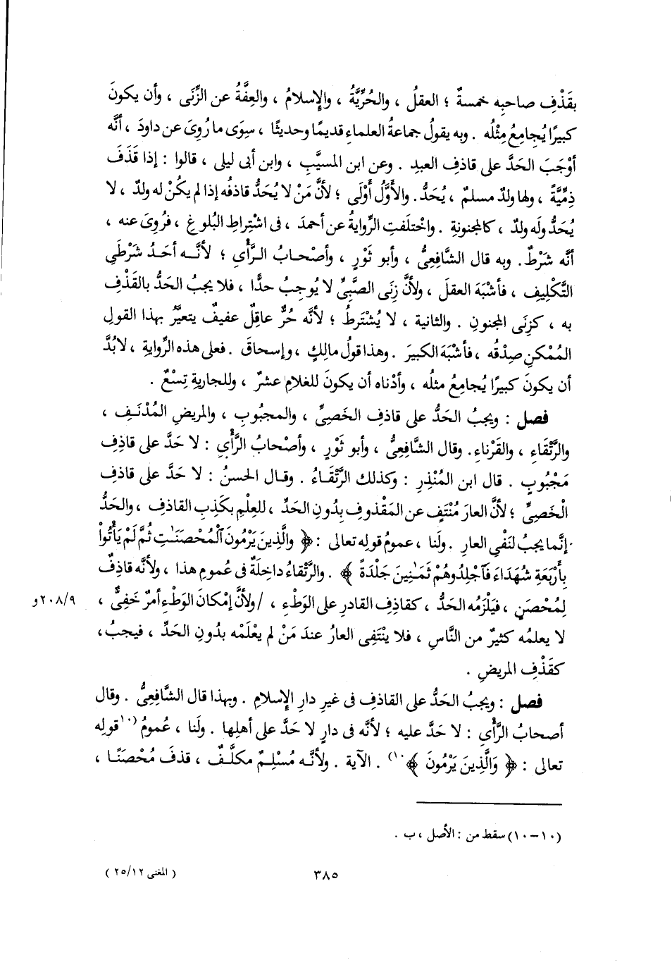 بقَذْفِ صاحبِه خمسةٌ؛ العقلُ، والحُرِّيَّةُ، والإِسلامُ، والعِفَّةُ عن الزِّنَى، وأن يكونَ كبيرًا يُجِامِعُ مِثْلُه. وبه يقولُ جاعةُ العلماءِ قديمًا وحديثًا، سِوَى ما رُوِىَ عن داودَ، أنَّه أوْجَبَ الحَدَّ على قاذفِ العبدِ. وعن ابن المسيَّبِ، وابن أبي ليلى، قالوا: إذا قَذَفَ ذِمِّيَّةً، ولها ولدٌ مسلمٌ، يُحَدُّ. والأَوَّلُ أَوْلَى؛ لأنَّ مَنْ لا يُحَدُّ قاذفُه إذا لم يكُنْ له ولدٌ، لا يُحَدُّ ولَه ولدٌ، كالمجنونةِ. واخْتلَفتِ الرِّوايةُ عن أحمدَ، في اشْتِراطِ البُلوغِ، فرُوِىَ عنه، أنَّه شَرْطٌ. وبه قال الشَّافِعِىُّ، وأبو ثَوْرٍ، وأصْحابُ الرَّأْىِ؛ لأنَّه أحَدُ شَرْطَىِ التَّكْلِيفِ، فأشْبَهَ العقلَ، ولأنَّ زِنَى الصَّبِىِّ لا يُوجِبُ حدًّا، فلا يجبُ الحَدُّ بالقَذْفِ به، كزِنَى المجنونِ. والثانية، لا يُشْتَرطُ؛ لأنَّه حُرٌّ عاقِلٌ عفيفٌ يتعيَّرُ بهذا القولِ المُمْكنِ صِدْقُه، فأشْبَهَ الكبيرَ. وهذا قولُ مالِكٍ، وإسحاقَ. فعلى هذه الرِّوايةِ، لا بُدَّ أن يكونَ كبيرًا يُجامِعُ مثلُه، وأدْناه أن يكونَ للغلامِ عشرٌ، وللجاريةِ تِسْعٌ.