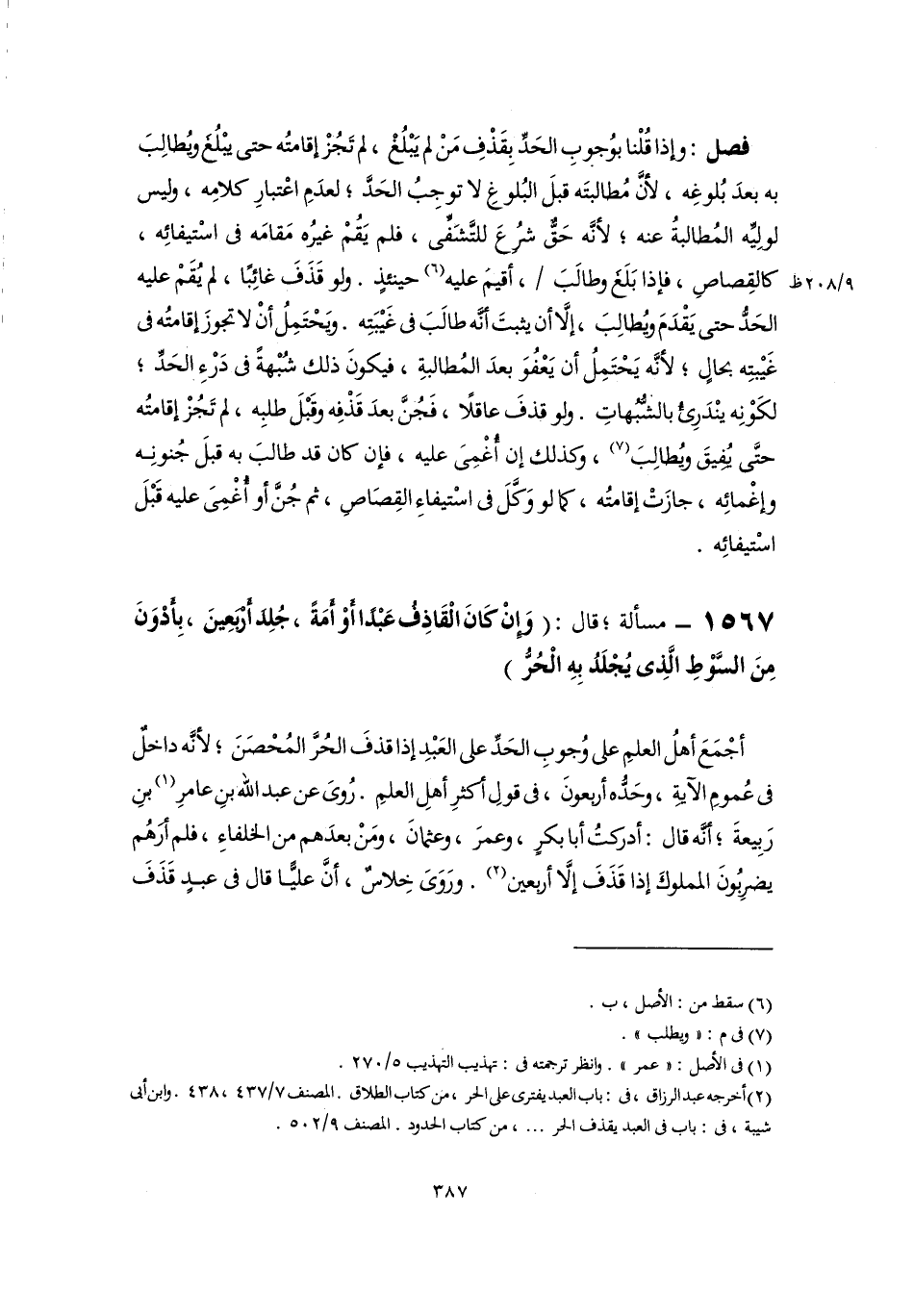 فصل: وإذا قُلْنا بوُجوبِ الحَدِّ بِقَذْفِ مَنْ لم يَبْلُغْ، لم تَجُزْ إقامتُه حتى يبْلُغَ ويُطالِبَ به بعدَ بُلوغِه، لأنَّ مُطالبتَه قبلَ البُلوغِ لا توجِبُ الحَدَّ؛ لعدَمِ اعْتبارِ كلامِه، وليس لولِيِّه المُطالبةُ عنه؛ لأنَّه حَقٌّ شُرِعَ للتَّشَفِّى، فلم يَقُمْ غيرُه مَقامَه في اسْتيفائِه، كالقِصاصِ، فإذا بَلَغ وطالَبَ، أقيمَ عليه (٦) حينئذٍ. ولو قَذَفَ غائِبًا، لم يُقَمْ عليه الحَدُّ حتى يَقْدَمَ ويُطالِبَ، إلَّا أن يثبتَ أنَّه طالَبَ في غَيْبَتِه. ويَحْتَمِلُ أنْ لا تجوزَ إقامتُه في غَيْبتِه بحالٍ؛ لأنَّه يَحْتَمِلُ أن يَعْفُوَ بعدَ المُطالبةِ، فيكونَ ذلك شُبْهةً في دَرْءِ الحَدِّ؛ لكَوْنِه ينْدَرِئُ بالشُّبُهاتِ. ولو قذفَ عاقلًا، فَجُنَّ بعدَ قَذْفِه وقَبْلَ طلبِه، لم تَجُزْ إقامتُه حتَّى يُفيقَ ويُطالِبَ (٧)، وكذلك إن أُغْمِىَ عليه، فإن كان قد طالبَ به قبلَ جُنونِه وإغْمائِه، جازَتْ إقامتُه، كما لو وَكَّلَ في اسْتيفاءِ القِصَاصِ، ثم جُنَّ أو أُغْمِىَ عليه قَبْلَ اسْتيفائِه.