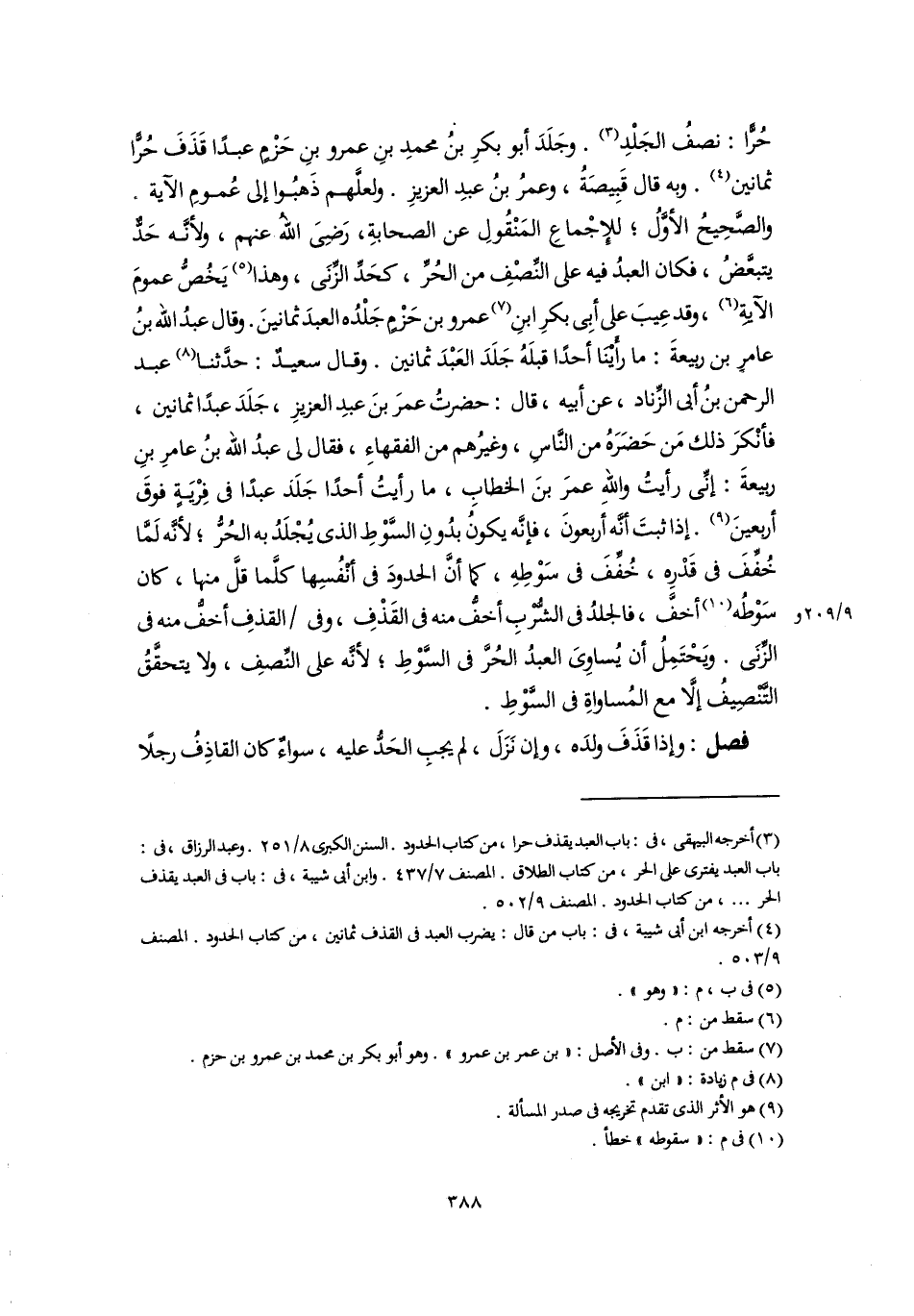 حُرًّا: نصفُ الجَلْدِ (٣). وجَلَدَ أبو بكرِ بنُ محمدِ بنِ عمرو بنِ حَزْمٍ عبدًا قَذَفَ حُرًّا ثمانين (٤). وبه قال قَبِيصَةُ، وعمرُ بنُ عبدِ العزيزِ. ولعلَّهم ذَهبُوا إلى عُمومِ الآية. والصَّحِيحُ الأوَّلُ؛ للإِجْماعِ المَنْقُولِ عن الصحابةِ، رَضِىَ اللهُ عنهم، ولأنَّه حَدٌّ يتبعَّضُ، فكان العبدُ فيه على النِّصْفِ من الحُرِّ، كحَدِّ الزِّنَى، وهذا (٥) يَخُصُّ عمومَ الآيةِ (٦)، وقد عِيبَ على أبِى بكرِ ابنِ (٧) عمرو بن حَزْمٍ جَلْدُه العبدَ ثمانينَ. وقال عبدُ اللَّه بنُ عامرٍ بن ربيعةَ: ما رأَيْنَا أحدًا قبلَهُ جَلَدَ العَبْدَ ثمانين. وقال سعيدٌ: حدَّثنا (٨) عبد الرحمن بنُ أبي الزِّناد، عن أبيه، قال: حضرتُ عمرَ بنَ عبدِ العزيزِ، جَلَدَ عبدًا ثمانين، فأنْكرَ ذلك مَن حَضَرَهُ من النَّاسِ، وغيرُهم من الفقهاءِ، فقال لي عبدُ اللَّه بنُ عامرِ بنِ ربيعةَ: إنِّي رأيتُ واللهِ عمرَ بنَ الخطابِ، ما رأيتُ أحدًا جَلَدَ عبدًا في فِرْيَةٍ فوقَ أربعينَ (٩). إذا ثبتَ أنَّه أربعونَ، فإنَّه يكونُ بدُونِ السَّوْطِ الذي يُجْلَدُ به الحُرُّ؛ لأنَّه لَمَّا خُفِّفَ في قَدْرِه، خُفِّفَ في سَوْطِهِ، كما أنَّ الحدودَ في أنْفُسِها كلَّما قلَّ منها، كان سَوْطُه (١٠) أخفَّ، فالجلدُ في الشُّرْبِ أخفُّ منه في القَذْفِ، وفى القذفِ أخفُّ منه في الزِّنَى. ويَحْتَمِلُ أن يُساوِىَ العبدُ الحُرَّ في السَّوْطِ؛ لأنَّه على النِّصفِ، ولا يتحقَّقُ التَّنْصِيفُ إلَّا مع المُساواةِ في السَّوْطِ.